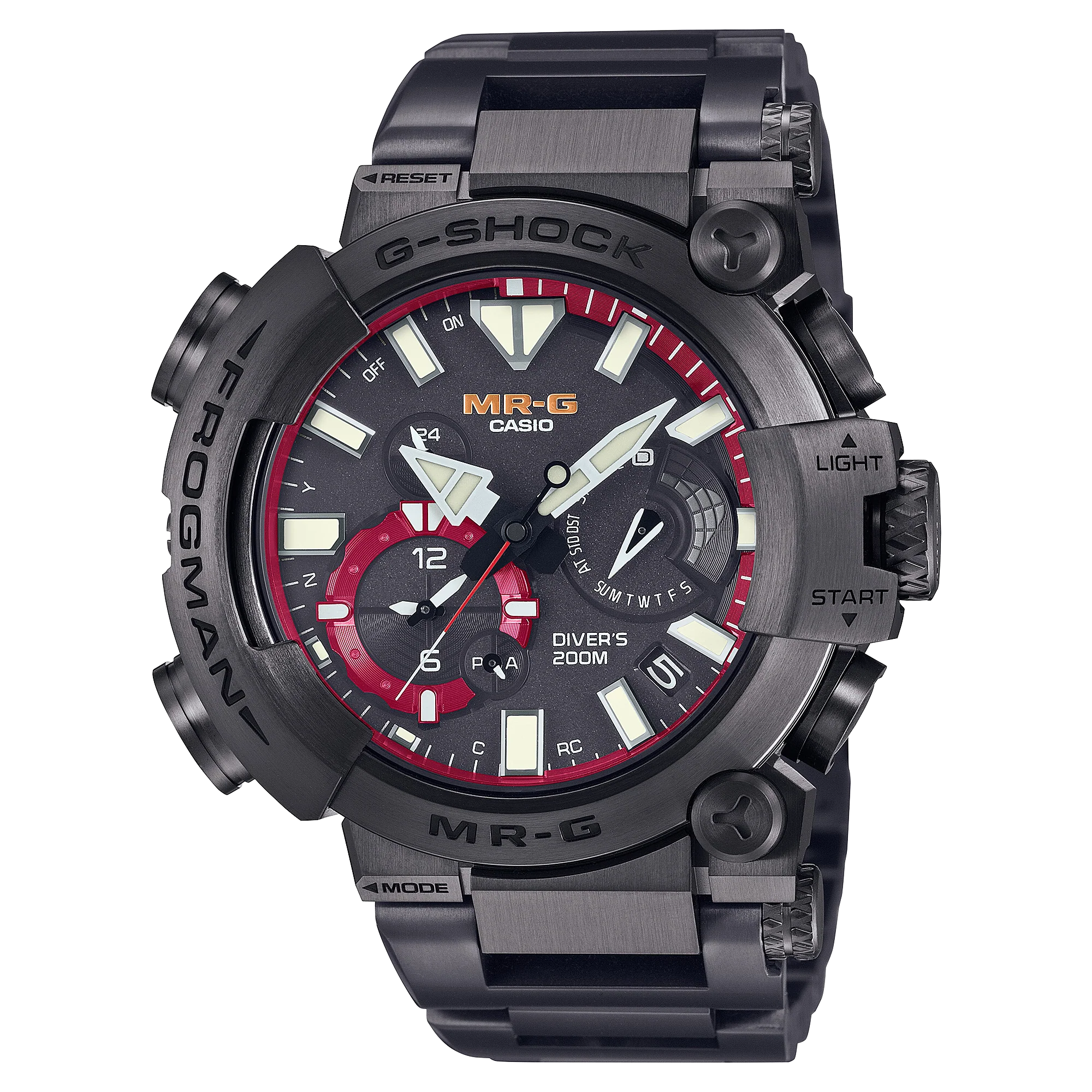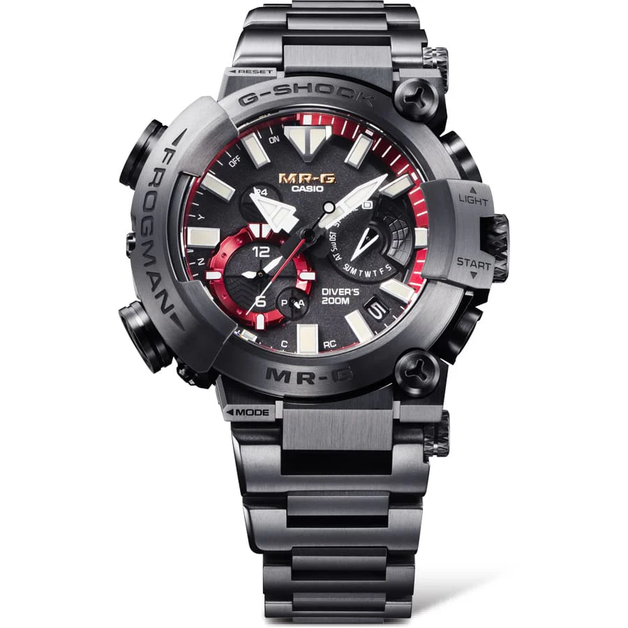 Experience the pinnacle of dive watch craftsmanship with the G-Shock MR-G Frogman men’s watch. This full-metal timepiece is crafted from titanium, treated with deep-layer hardening and a DLC coating for unrivalled strength and a premium black finish. It offers ISO 200-metre water resistance for professional use, housed in a substantial case measuring 5.6 centimetres long by 4.97 centimetres wide and 1.86 centimetres thick. The exquisite design features a spherical sapphire crystal and deep red dial accents, merging high style with high-tech functionality like Tough Solar power and automatic time adjustment via Multi Band 6 and Bluetooth.