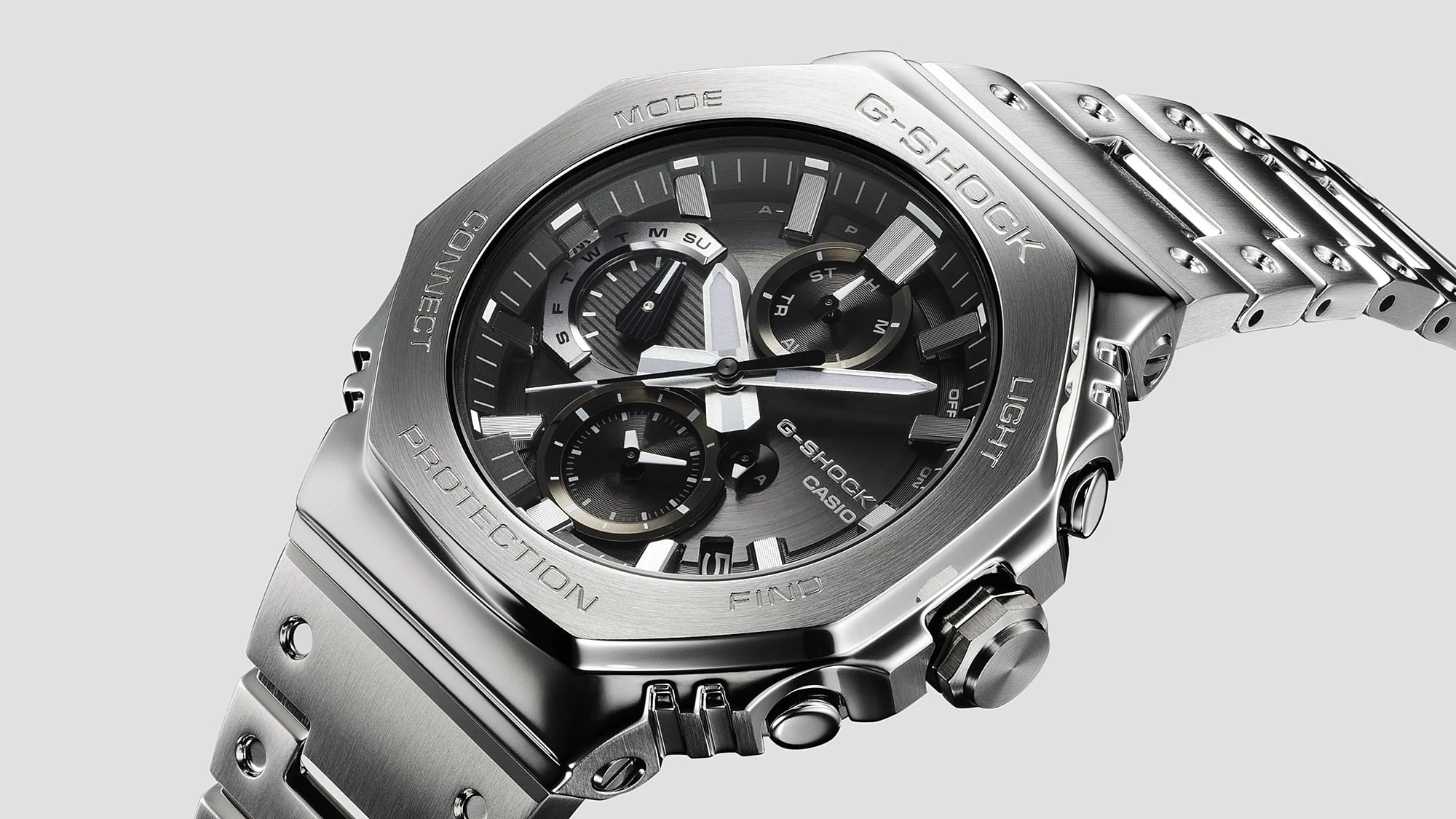 Experience the G-SHOCK full-metal chronograph, a refined evolution of the DW-5000C heritage, crafted in stainless steel with a robust case, bezel and bracelet that exude sophistication, detailed by a dark dial. The octagonal bezel, three-dimensionally forged, is finished with a circular hairline top and mirror-polished slopes, while the dial features precise indexes and inset rings achieved with Casio’s precision processing. A screw-lock crown echoes the bezel’s shape, delivering a compact profile without compromising shock resistance. Module is slim yet feature-rich, pairing with a smartphone via Bluetooth for automatic timekeeping, Tough Solar power, LED light, and 200 m water resistance. Case size 5.13 cm × 4.63 cm × 1.24 cm. This men’s watch blends rugged capability with premium design.