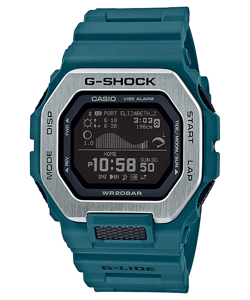 Experience durability and style with the G-Shock G-Glide Blue Resin Watch GBX100-2A. This watch is water resistant up to 200 meters and features shock resistance technology, making it perfect for any outdoor adventure. The blue resin band adds a pop of color while the digital display and G-LIDE surf-specific functions keep you on track.