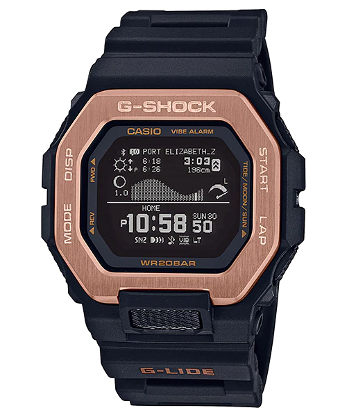 Crafted to take on even the craziest wipeouts in wild waves, the guard provides 360° impact protection. The bezel, a fusion of resin and metal, is designed for distinction. Contrasting honing and hairline finishes on the GBX-100 stainless steel upper bezel add the final touch to this stylish sporting timepiece.