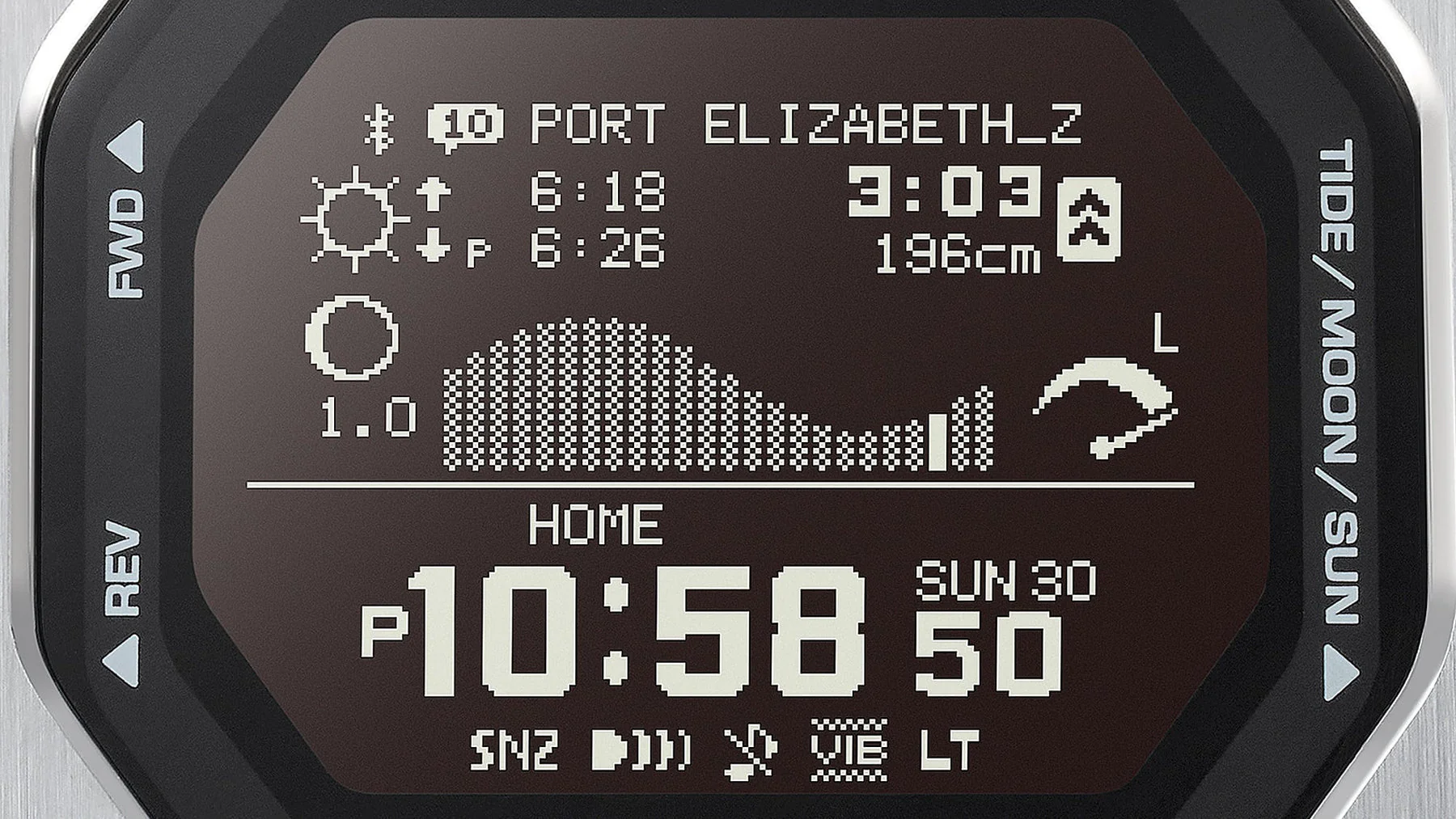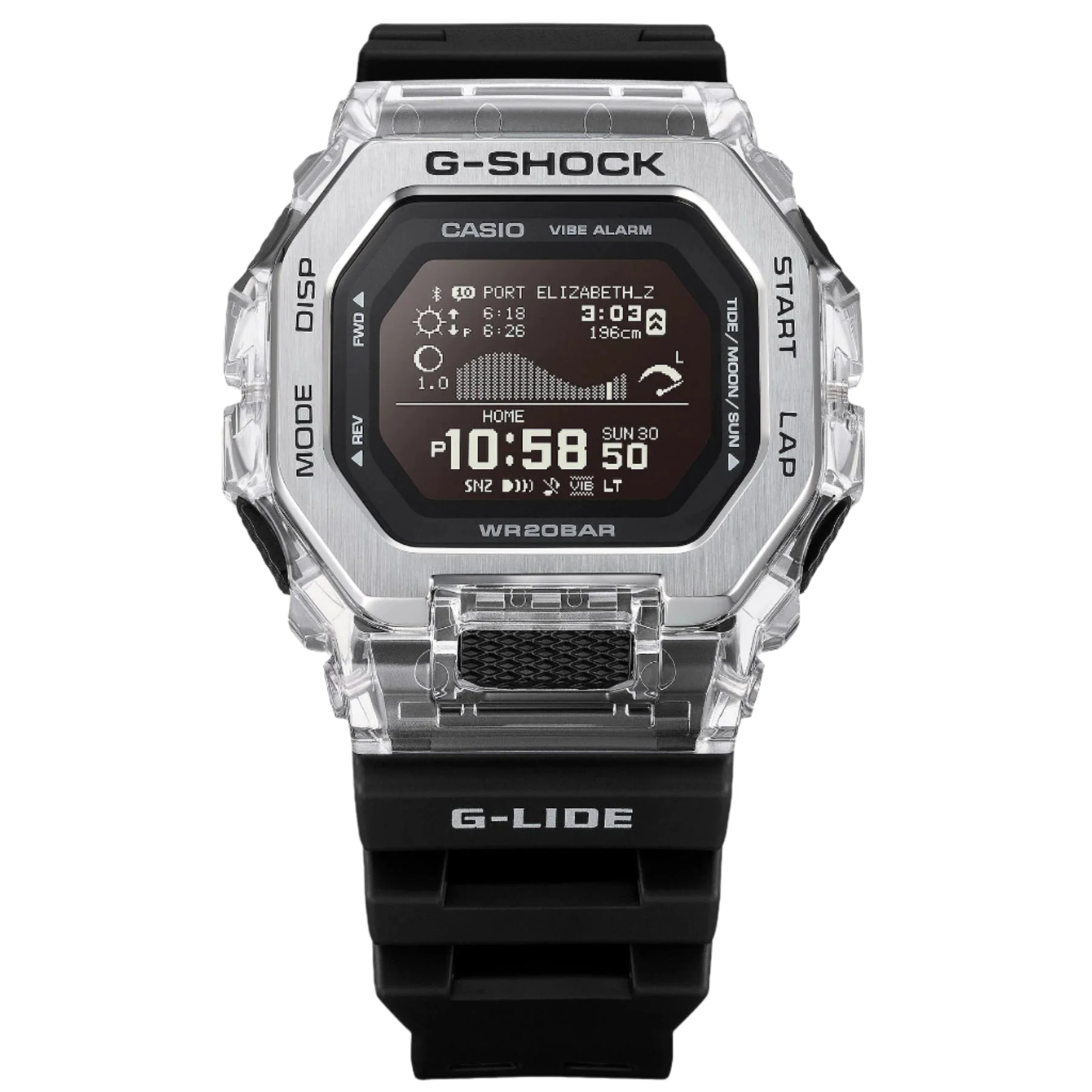 Sleek, functional, and surf-ready, the G-Shock GLIDE GBX100S-1D men’s watch blends rugged performance with modern design for an active lifestyle. Engineered with a stainless steel and resin case, this timepiece captures the glimmer of ocean waves with its dual-material bezel and polished edges. The black dial offers exceptional clarity, housed beneath durable mineral crystal glass. A bio-based resin band ensures lightweight comfort and a secure fit, ideal for water sports or everyday wear. With 200-meter water resistance, tide graph functionality, moon data, and sunrise/sunset display, it’s purpose-built for surfers and outdoor enthusiasts. Smart features include Bluetooth connectivity, smartphone link via G-SHOCK MOVE, and a suite of training tools to track pace, distance, and calories burned. This watch stands out in the men’s watches category with its unique blend of style, durability, and performance, making it a reliable companion from the beach to beyond.