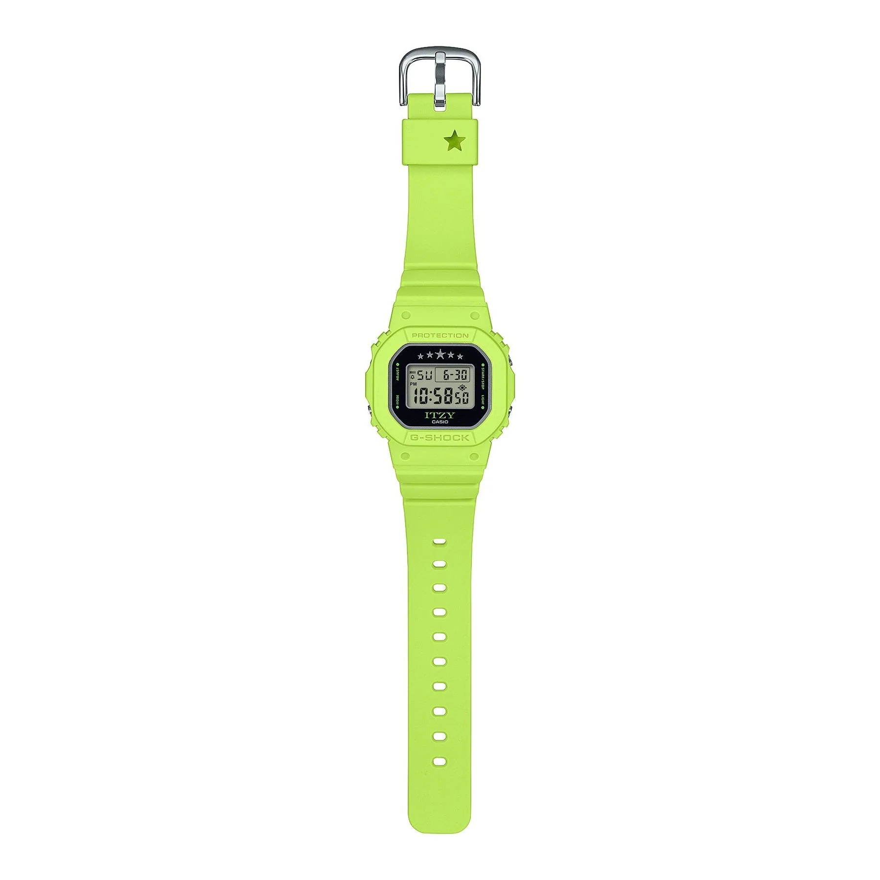 The G-Shock ITZY Green Resin Band Watch GMDS5610IT-3D merges iconic durability with fresh, expressive design. A standout in the watches category, this men’s watch and women’s watch features a bold bio-based green resin band and a sleek 45.7mm case, crafted for comfort and resilience. The mineral crystal glass enhances clarity, while five mirror-finish stars on the dial and a star-cut band loop reflect ITZY’s signature flair. Designed for performance, it offers 200-meter water resistance, shock resistance, and precise quartz movement. With LED backlight, countdown timer, full auto-calendar, and multiple alarms, it balances fashion and function effortlessly—an eco-conscious timepiece that celebrates individuality and high performance.