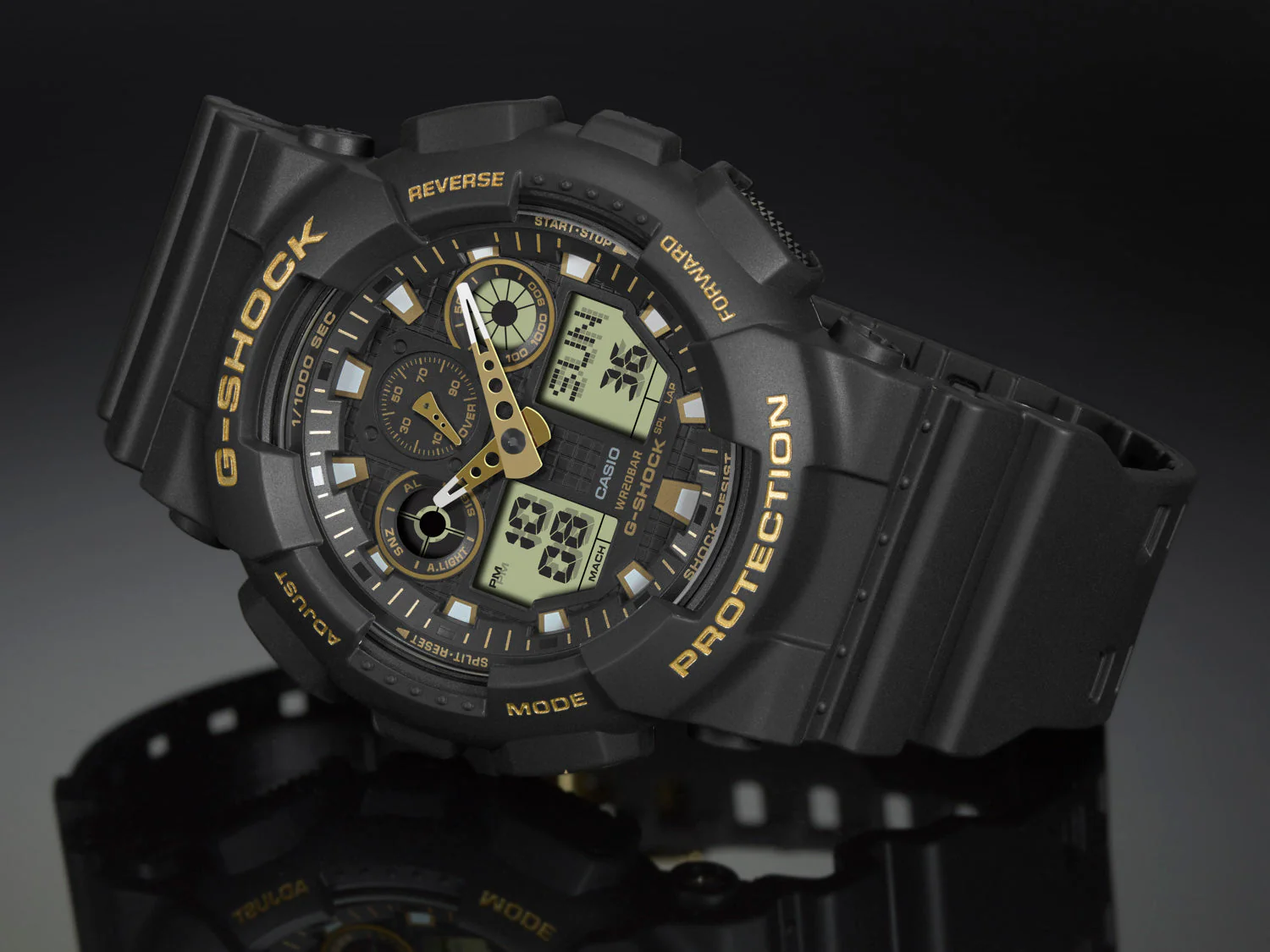 From G-SHOCK, the watch brand that is constantly setting new standards for timekeeping toughness, come new additions to the standard model lineup. The popular DW-9052, big case GA-100, and combination AW-591 start out with basic G-SHOCK black, which is then accented with brilliant rose gold and gold accents. The new gold-accented designs are really attractive additions to the G-SHOCK lineup.