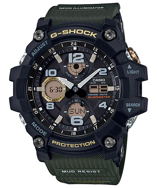 MASTER OF G Series MUDMASTER, the watch that is designed and engineered for wear and use by those whose work takes them into areas scattered with rubble, dirt, and debris, is proud to announce new models that pack solar powered operation into dirt and mud resistant configurations. The button guard cylinder structure of these models seals out mud and dust, enabling use in severe environments. Cylindrical piping protects buttons against impact and improves their operation, and gaskets inside the buttons prevent the entry of fine sand and dust particles. The rugged designs of these watches are in the image of the special purpose vehicles and tools that are used by disaster relief teams.