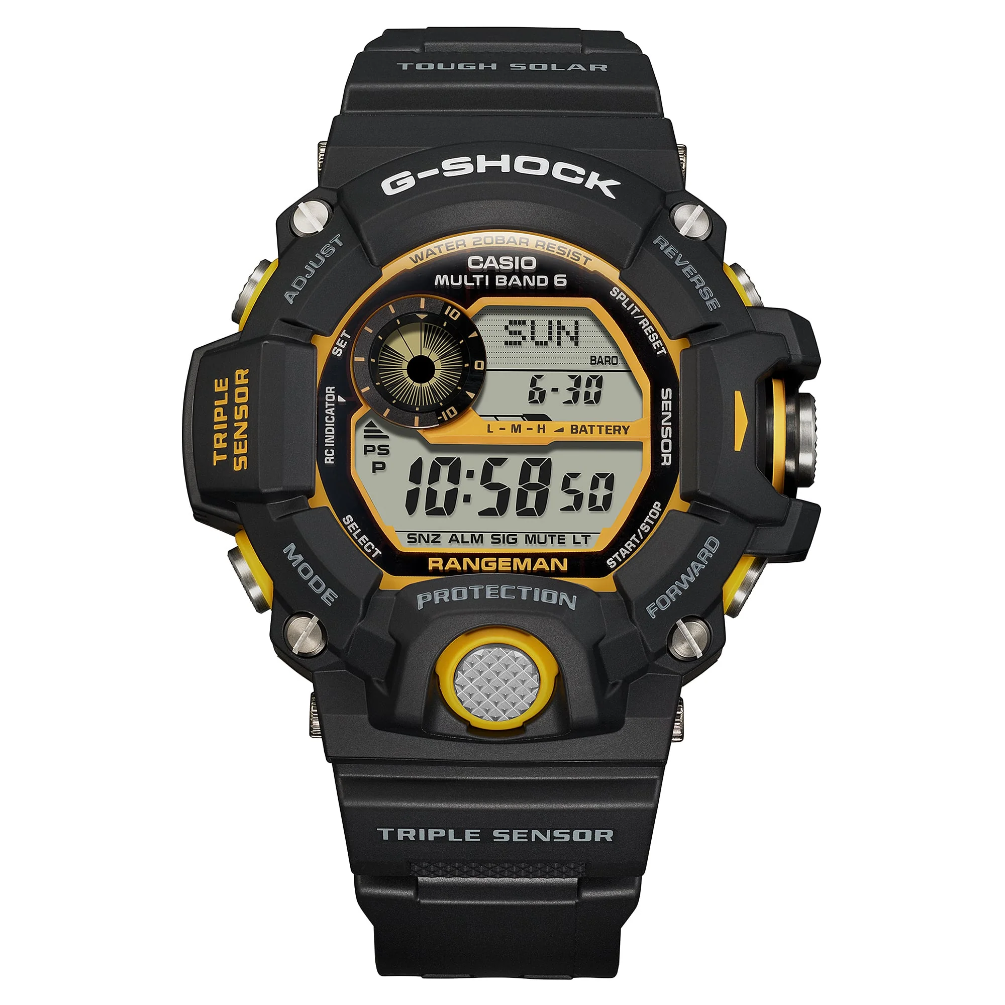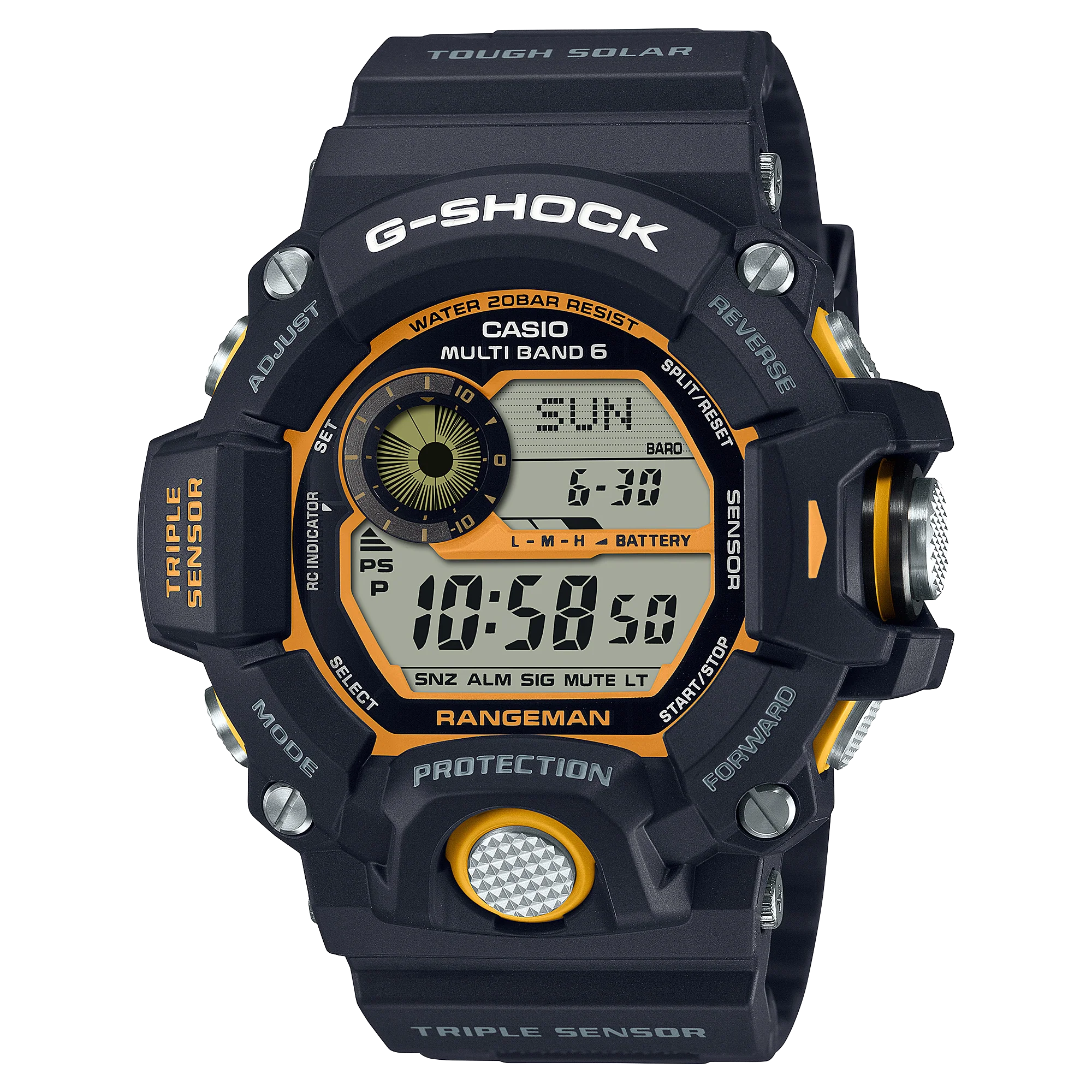 Experience the ultimate in durability and style with this rugged timepiece featuring a striking color scheme. Specially designed for use in the toughest environments, the MASTER of G watch line sets a new standard in precision by incorporating bright yellow accents used for emergency rescues. The GW-9400 RANGEMAN is equipped with Triple Sensor technology, providing altitude, direction, temperature, and barometric pressure readings right on your wrist. The cylindrical button guard structure ensures accurate and seamless operation of the sensor button, while three different beeps indicate the current measurement mode for convenient “no-look” operation during your next rugged adventure.