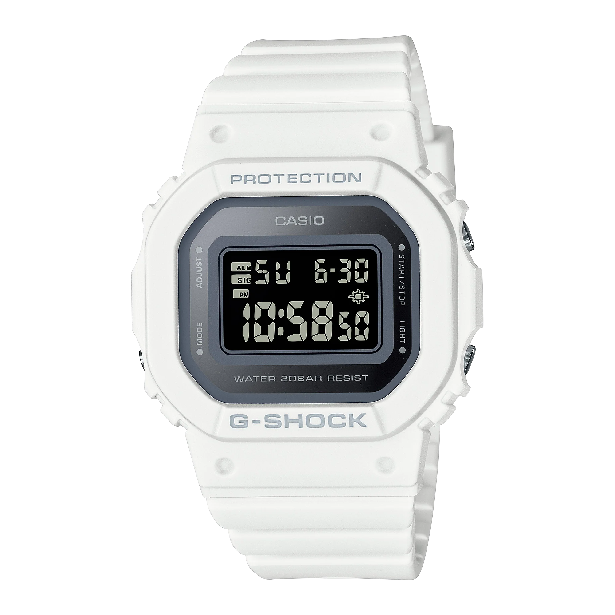 A refined reinterpretation of the iconic 5600 series, the G-Shock Mid Digital Metallic Black Dial Watch GMDS5600-7D combines high-performance function with a sleek, compact design. Crafted with a durable resin case and band in crisp white, this women’s watch features a metallic black dial achieved through a precision glass vapor deposition process, offering a modern statement that stands out effortlessly. It delivers exceptional utility with 200-meter water resistance, shock resistance, and a full auto-calendar through 2099, while maintaining everyday elegance with its minimal silhouette and LED backlight for enhanced readability.