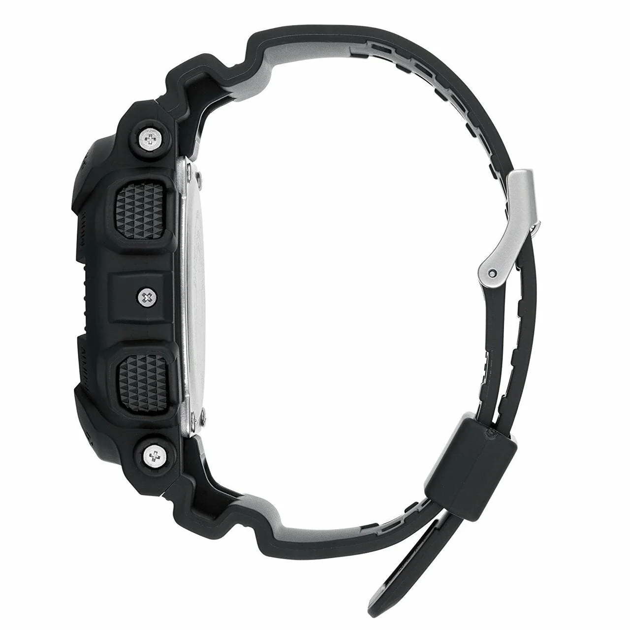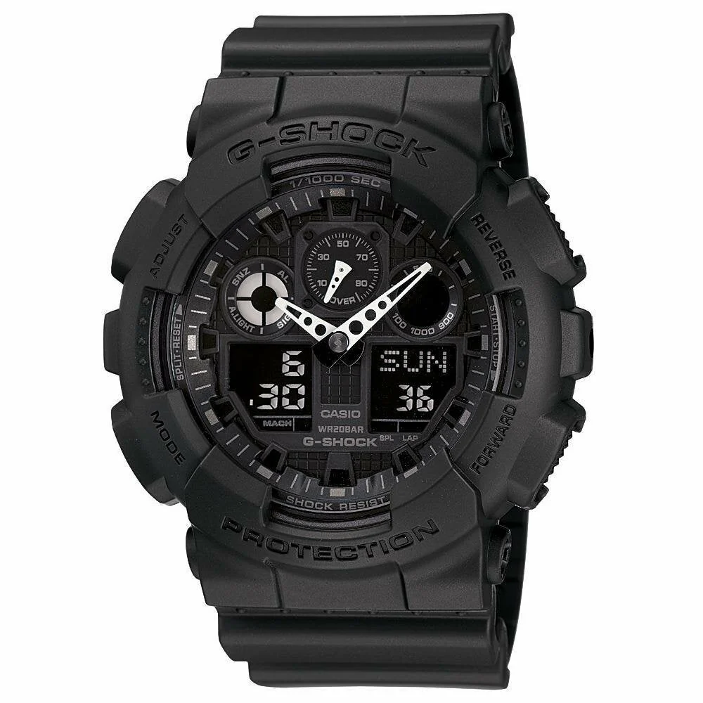 The G-Shock Military Matte Black GA100-1A1 men’s watch blends rugged performance with bold design, making it a standout in the sport watch category. Crafted with a durable matte black resin band and housed in a commanding 51mm case, this timepiece features a striking digital-analog display accented by 3-D embossed indexes and a reinforced rivet bezel. Designed for extreme conditions, it offers shock resistance, 200-meter water resistance, and anti-magnetic structure, ensuring reliability in any environment. With features like world time, auto LED light, five alarms, and a 1/1000-second stopwatch with speed indicator, it delivers advanced functionality in a streamlined all black aesthetic. A modern essential for those who demand precision and power in their daily wear.