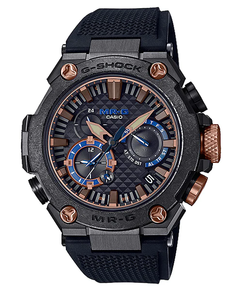 The G-Shock MR-G Black Rubber Band Watch MRGB2000R-1A fuses contemporary innovation with revered Japanese heritage, featuring a robust 5.47 cm case in recrystallised titanium that mirrors the intricate nie patterns of traditional swords. This men’s watch is adorned with subtle kachi-iro navy accents, a mark of victory rooted in samurai tradition, enhancing both its aesthetic and symbolism. A Durasoft rubber band with a Bishamon tortoise shell motif delivers refined comfort and resilience. The dial’s scaly texturing and sword-inspired indices underline meticulous craftsmanship, while the scratch-resistant sapphire crystal and solar-powered movement ensure unwavering performance. Bluetooth® connectivity and advanced timekeeping features bring modern functionality to this enduring symbol of strength and elegance.
