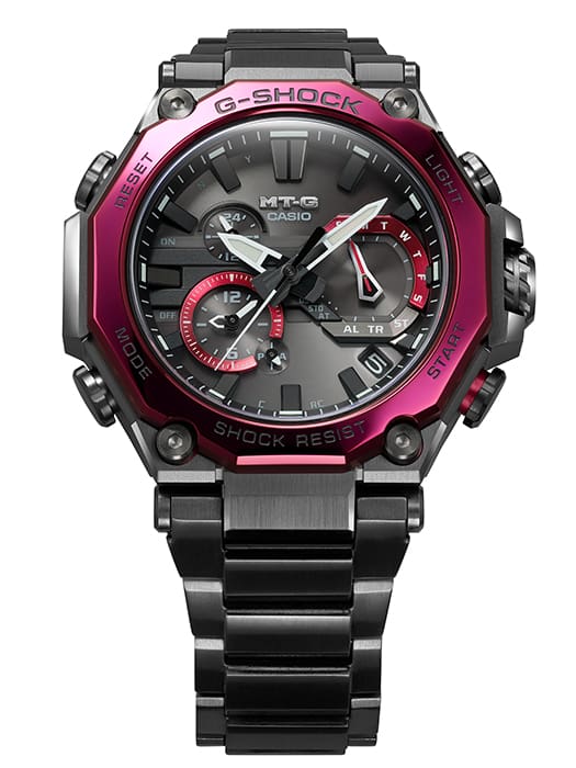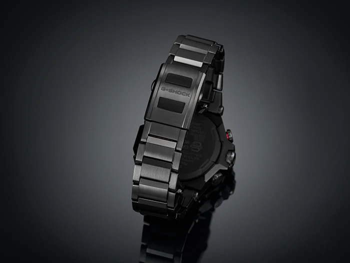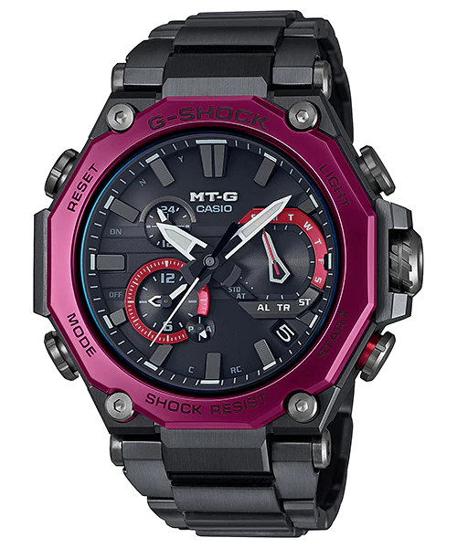 The MTG-B2000BD men’s watch showcases G-SHOCK’s advanced Dual Core Guard Structure, blending the rigidity of a carbon monocoque case with a strong metal frame. The case measures 5.51 centimetres long by 4.98 centimetres wide and 1.59 centimetres thick. This timepiece features a sophisticated black ion-plated case complemented by a striking Bordeaux-coloured ion-plated bezel, enhancing its premium aesthetic. The layered-composite band, featuring both metal and fine resin parts, provides superior comfort while significantly reducing weight. As a Solar-Powered Radio Control Module watch, it guarantees exceptional accuracy globally via Multi Band 6 and Bluetooth® connectivity, making it a rugged yet refined choice.