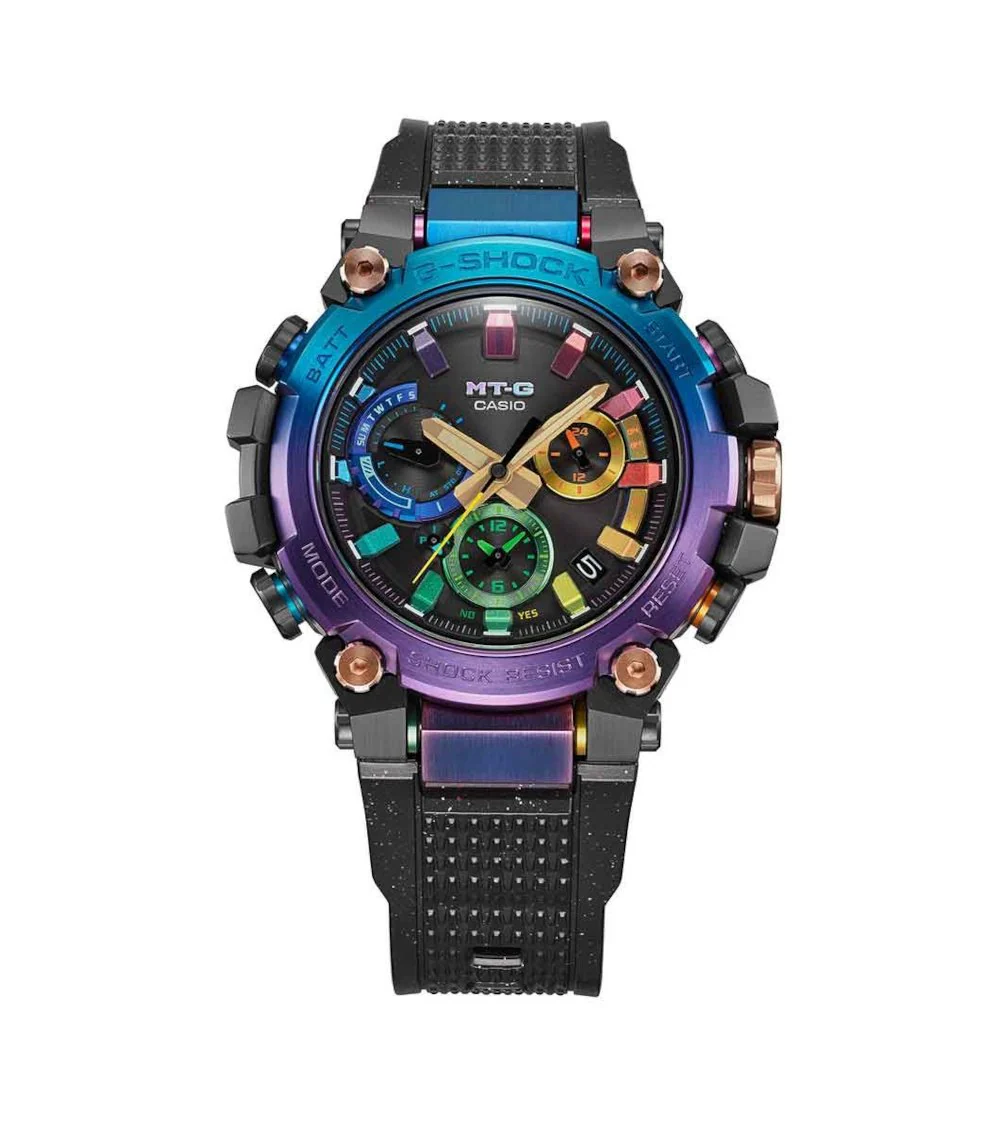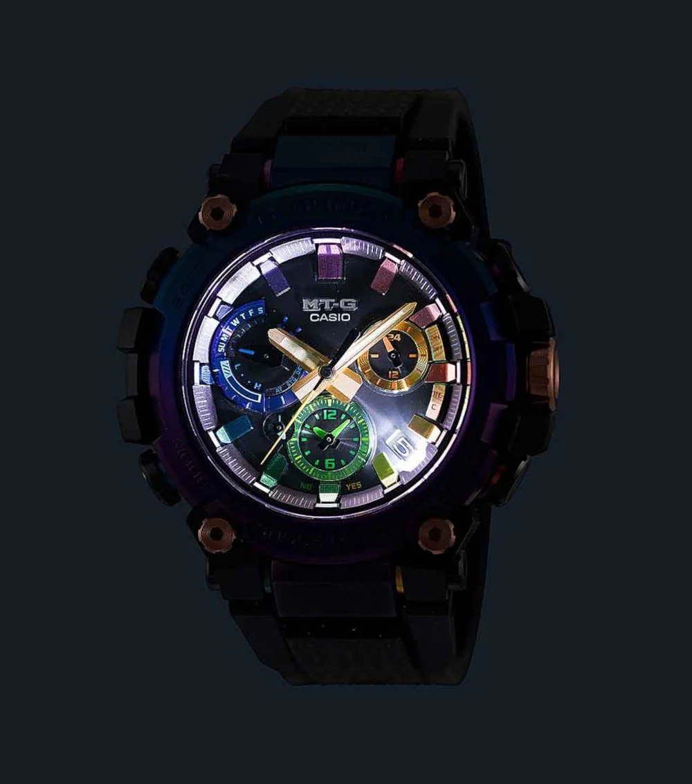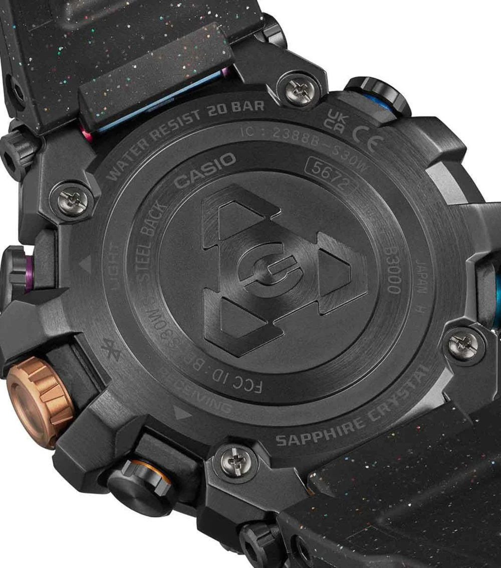 The MTG-B3000DN men’s watch, inspired by the radiant beauty of a nebula, is an innovative timepiece built on a new, compact Dual Core Guard structure. The bezel and dial components capture this cosmic beauty with exquisite gradated blue and purple ion plating and complementary multi-coloured accents. Measuring 5.19 centimetres long by 5.09 centimetres wide and a slim 1.21 centimetres thick, the watch is engineered for extreme toughness with Triple G Resist. It features a soft black urethane band with interspersed aluminium for comfortable wear. This G-SHOCK ensures unwavering precision through Tough Solar power, Multi Band 6 radio control, and seamless Bluetooth® connectivity for easy setting.