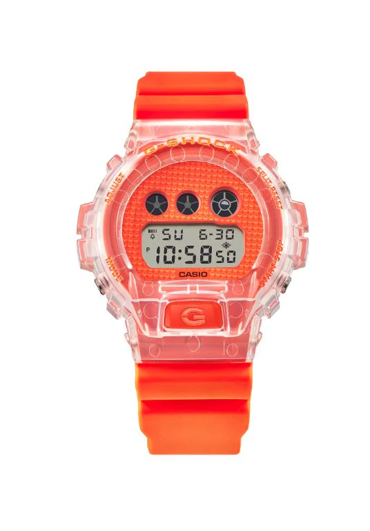 Infused with vibrant pop culture energy, the G-Shock DW6900GL-4D men’s watch features a bold orange resin band and dial, inspired by the playful spirit of Japanese capsule toys. Crafted with a durable resin case and bezel, this timepiece offers shock resistance and 200-meter water resistance, combining rugged performance with a unique design appeal. The mineral crystal glass protects a multifunction digital display powered by precise quartz movement, complemented by an electro-luminescent backlight with afterglow for enhanced visibility.