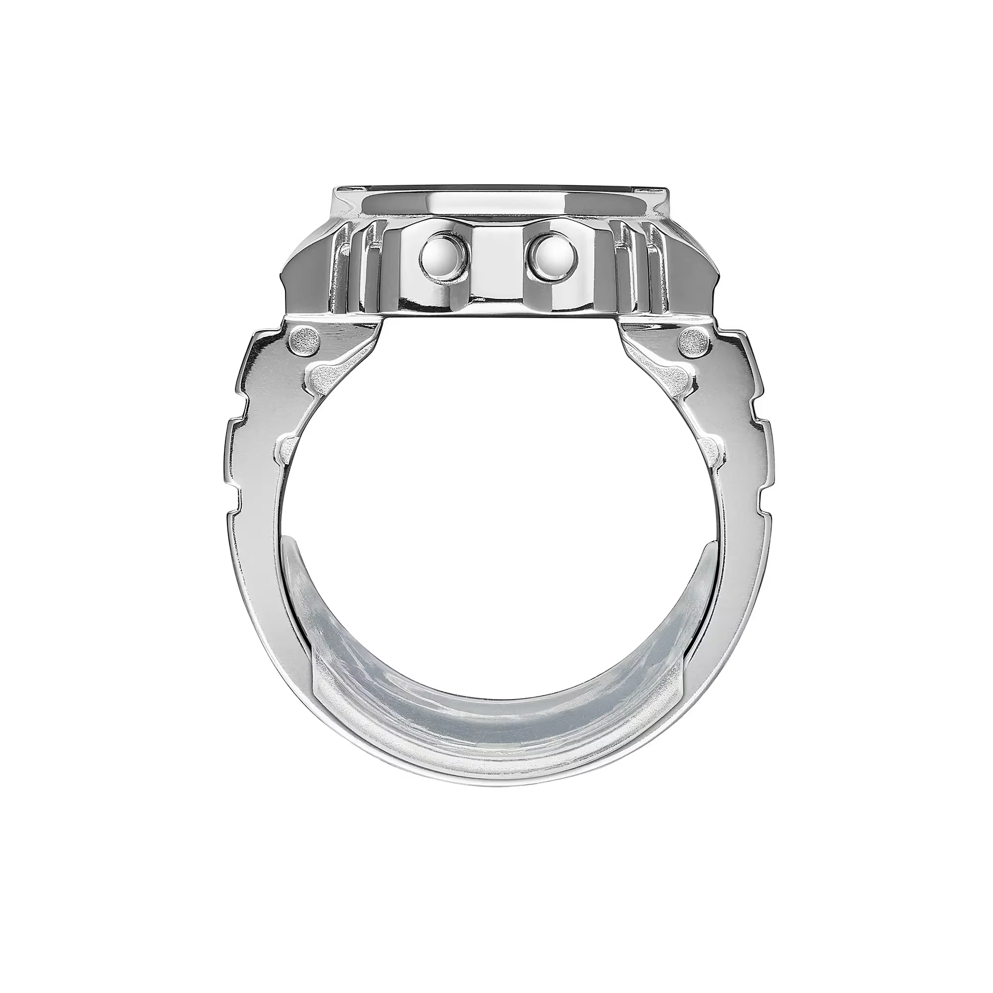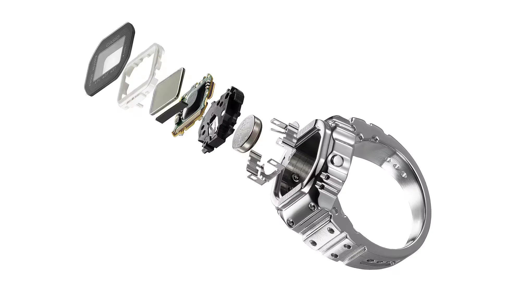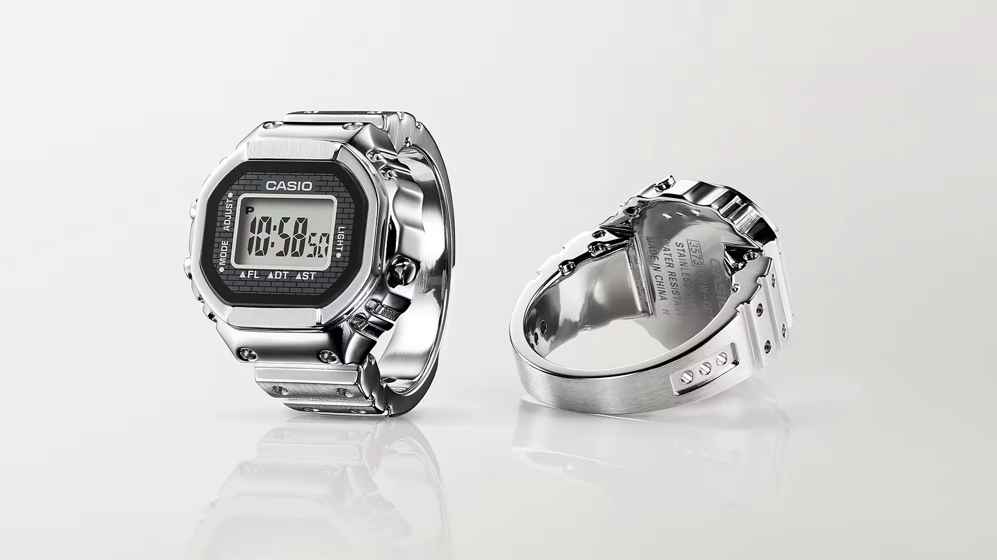 A ring-sized watch of Casio Watches. A whole new style of digital watch — both practical and playful — thanks to a miniature module and advanced metalworking technology. Creating a ring-sized, full-metal version of the Casio watch’s complex form is no easy feat. To make this possible, we needed to use a special method of metal processing to inject a mixture of fine metal powders and resin into a mold. Using metal injection molding (MIM), the case, case back, and ring are molded in one piece, with even the dimpled design on the band faithfully reproduced. A special glass adhesive technique ensures a tight seal for a watch built to be water-resistant while still allowing the battery to be replaced. With an inner diameter of 20 mm and a circumference of 62.8 mm, the ring fits a size 22 finger (US 10.5, EU U) and includes two size-adjusting spacers, in size 19 (19-mm inner diameter) and 16 (18-mm inner diameter). We downsized the standard watch module by a factor of 10 and combined it with a small button battery to create a 3-button digital watch that fits on your finger. Even at this small size, the watch features a 7-segment LCD that displays not only the time down to the second, but also the date, dual time, and stopwatch functionality. Preset the time of your choice, and the ring watch gives off a subtle, flashing light — not only handy for keeping time, but also a poetic nod to the fleeting twinkle of time.