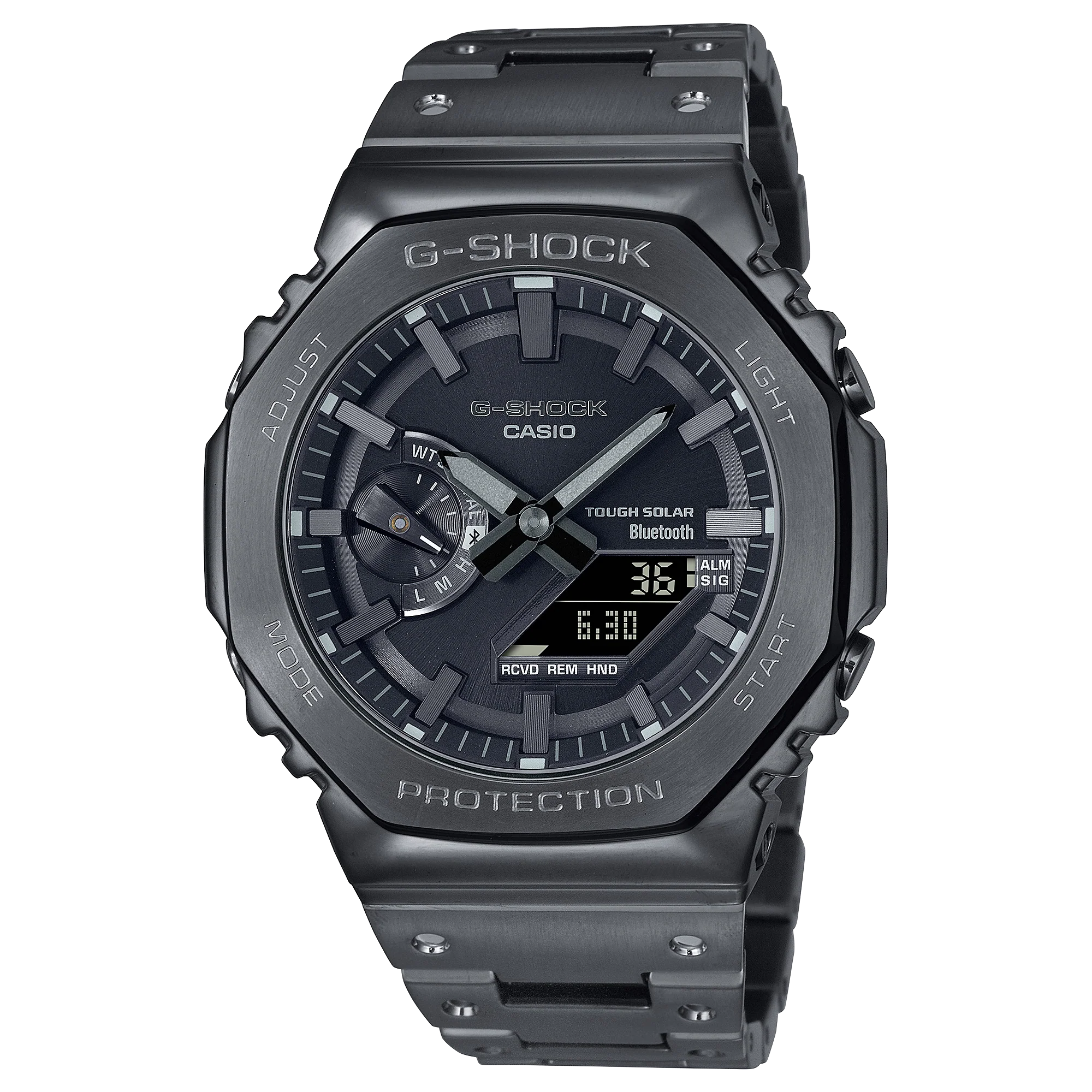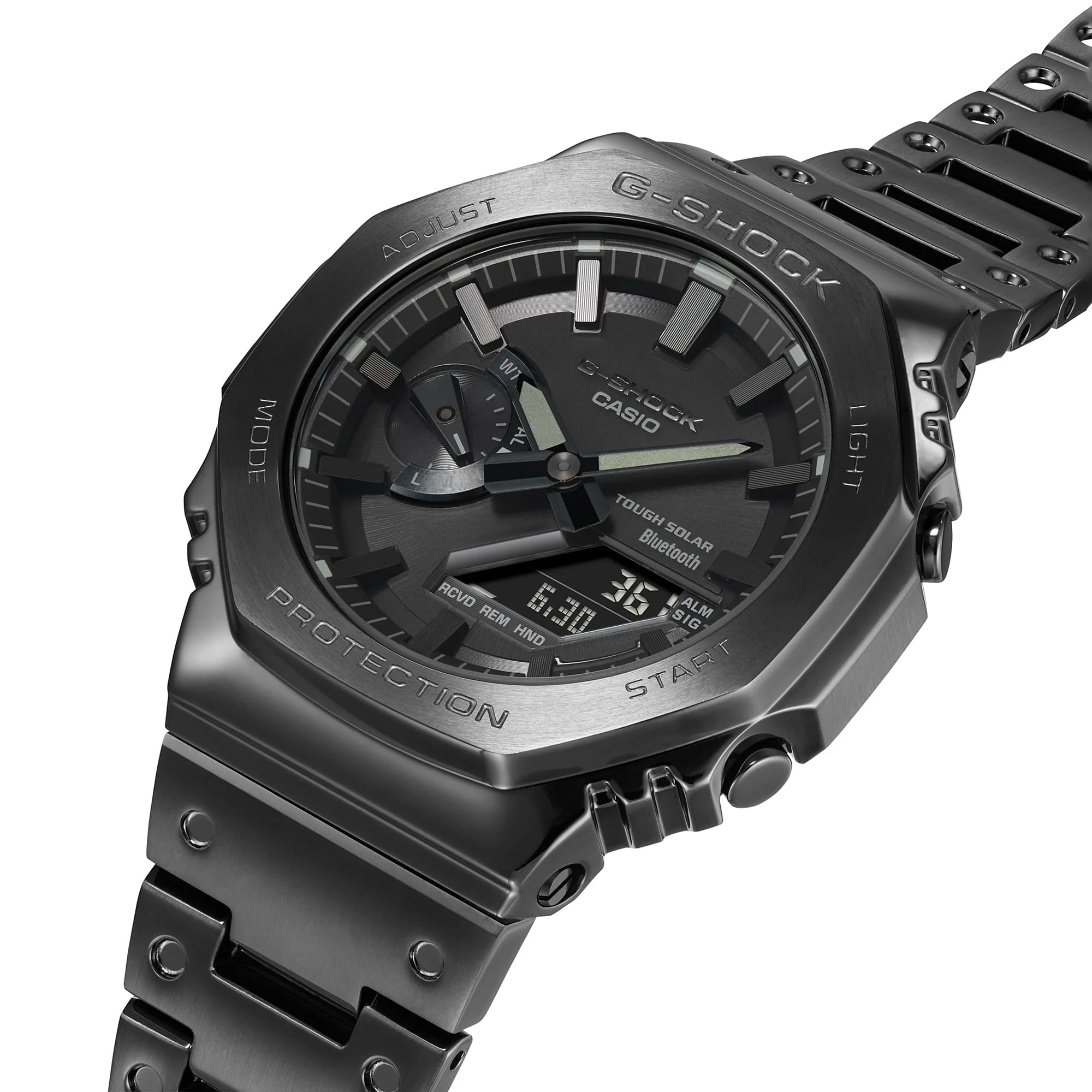 Introducing the G-Shock Solar CasiOak Steel Bluetooth GMB2100BD-1A – the epitome of luxury, durability, and functionality. This tastefully crafted timepiece takes its design cues from DW-5000C’s timeless octagonal bezel and dimpled band design but in a more streamlined, minimalist style.