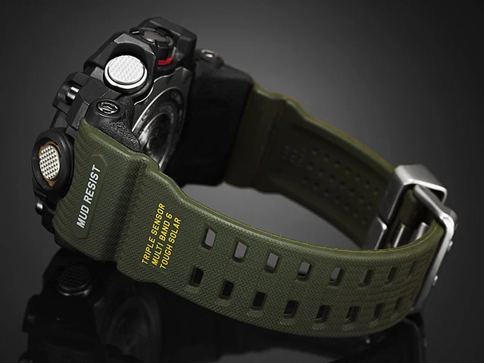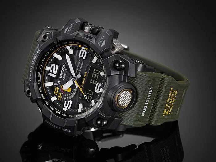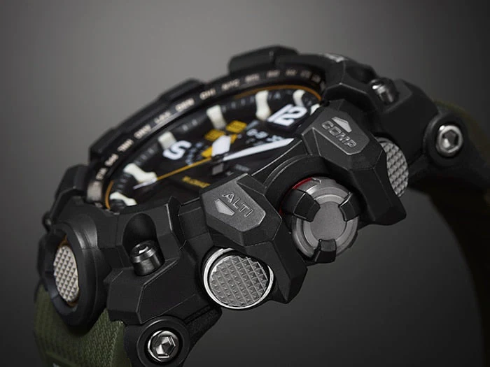 This new MUDMASTER model was created especially for those whose work takes them to areas where piles of rubble, dirt, and debris are present. A special vibration-resistant construction lets them stand up to wear while operating cutters, crushers, drills and other heavy machinery to clear way large obstacles. This is CASIO’s first analog watch to come with Mud Resist construction, which helps to ensure that nothing gets into the watch when down and dirty work takes you deep into the dirt and sludge. Multiple gaskets are used on the pipes that guide buttons and shafts, which keeps mud out. These pipes not only act to protect buttons from impact, they also enhance button operation. The screw-in force of the screw lock bezel on an internal gasket further increases mud resistance.