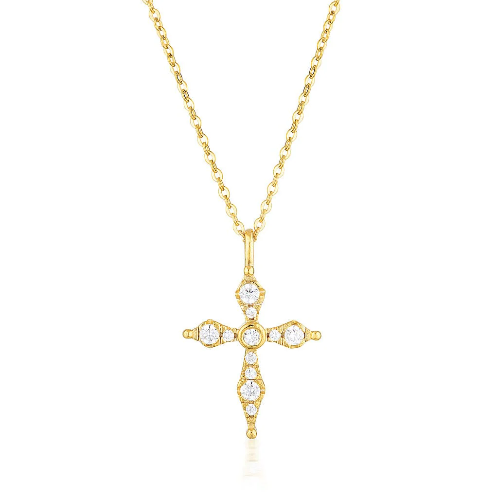 The BLESS mini Gold Cross is just too gorgeous for words! Delicate in design but big on style. Layer this beautifully crafted mini Cross for an on trend look. Crafted in 925 sterling Silver and plated in 18K Gold.