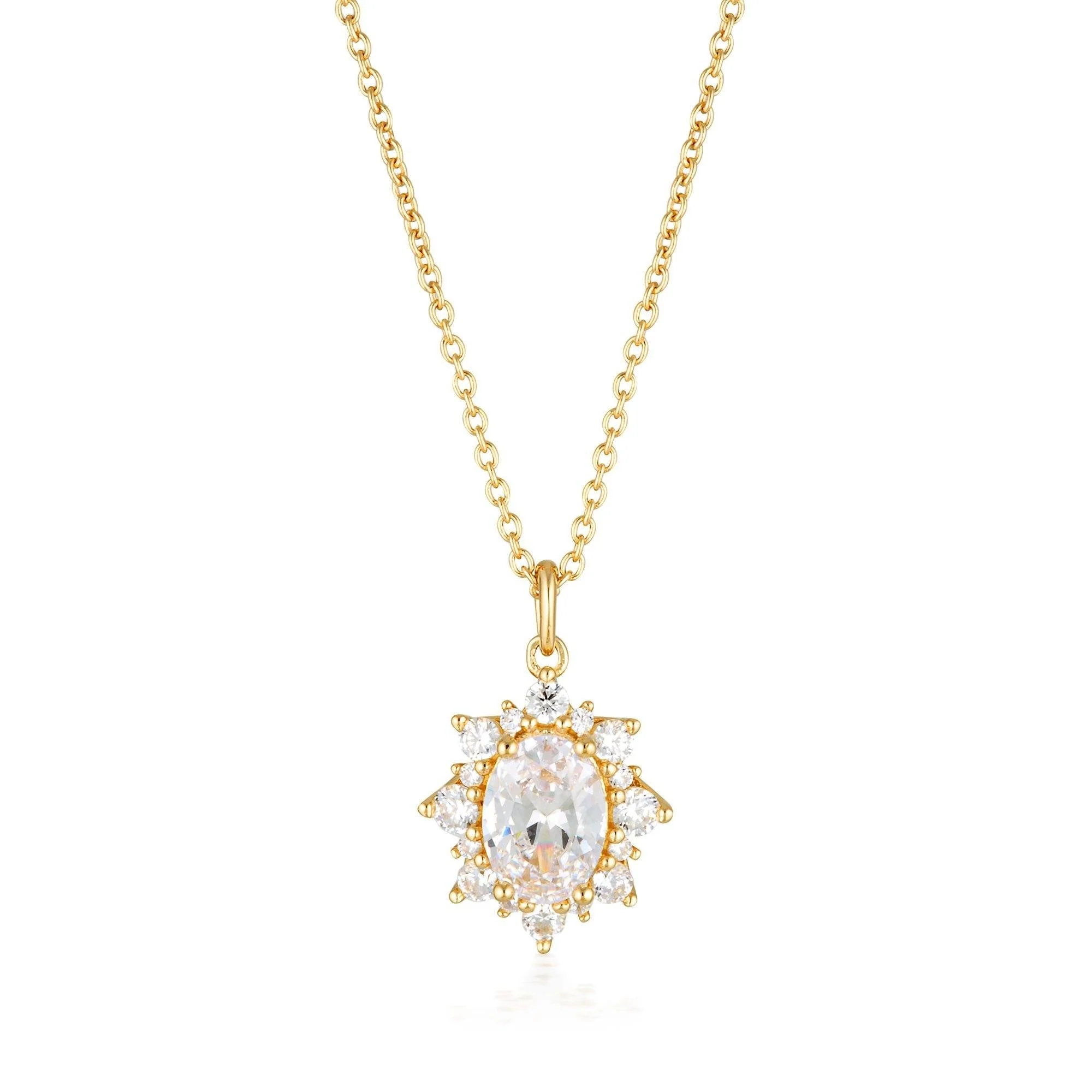 The Eloise pendant by Georgini blossoms with romance. Framed with a halo of petite shine this pendant is a new take on classic Georgini Bridal elegance. Pair with the Eloise Earrings for the perfect Bridal set. Crafted in 18ct Gold plated 925 Sterling Silver the pendant is set on a 41cm chain with a 5cm extension and measures approximately 16.5mm long by 11mm wide.