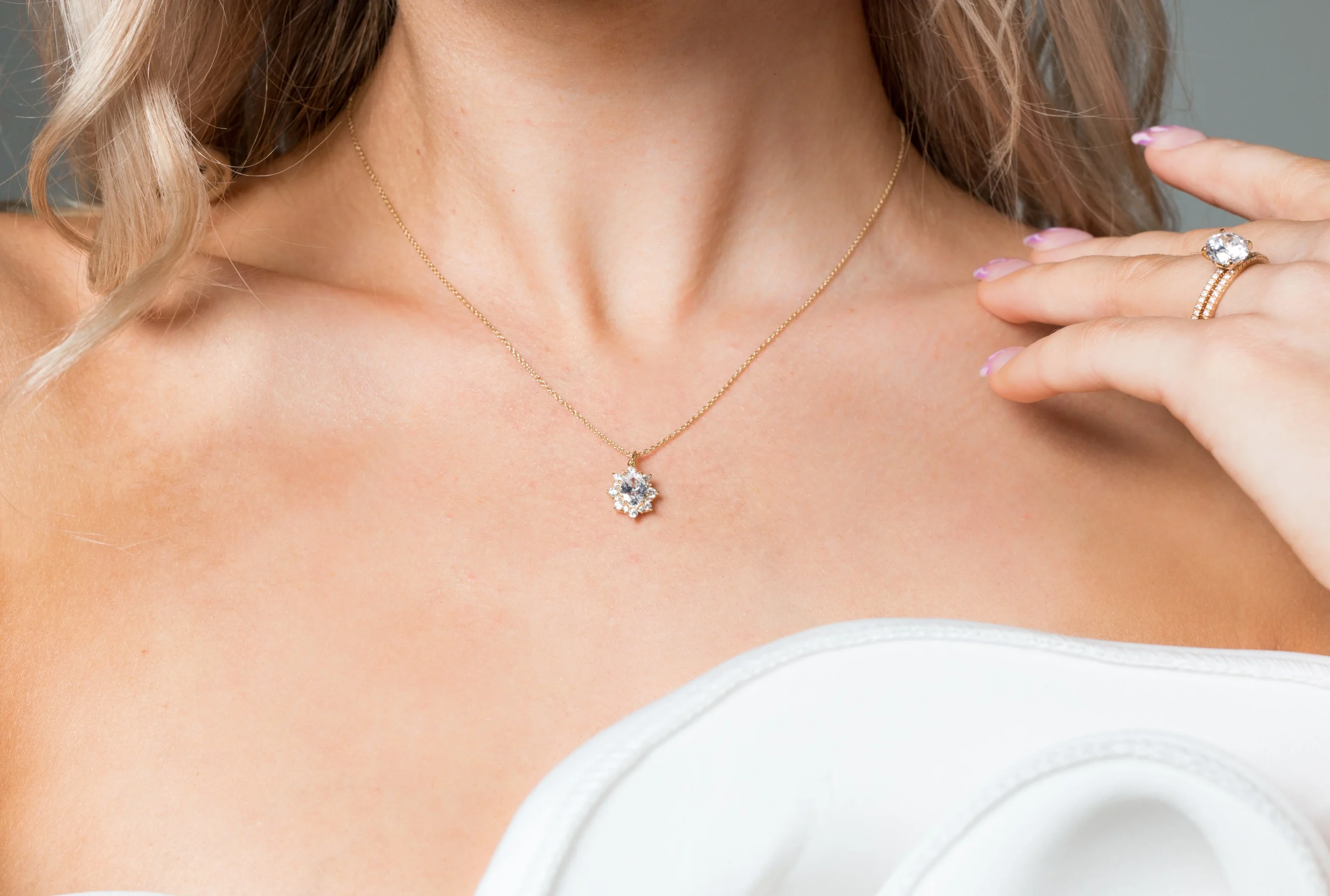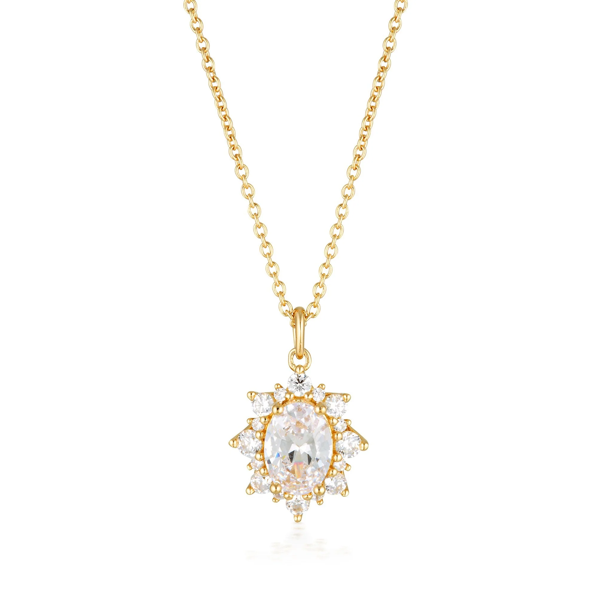 The Eloise pendant by Georgini blossoms with romance.  Framed with a halo of petite shine this pendant is a new take on classic Georgini Bridal elegance.  Pair with the Eloise Earrings for the perfect Bridal set. Crafted in 18ct Gold plated 925 Sterling Silver the pendant is set on a 41cm chain with a 5cm extension and measures approximately 16.5mm long by 11mm wide.