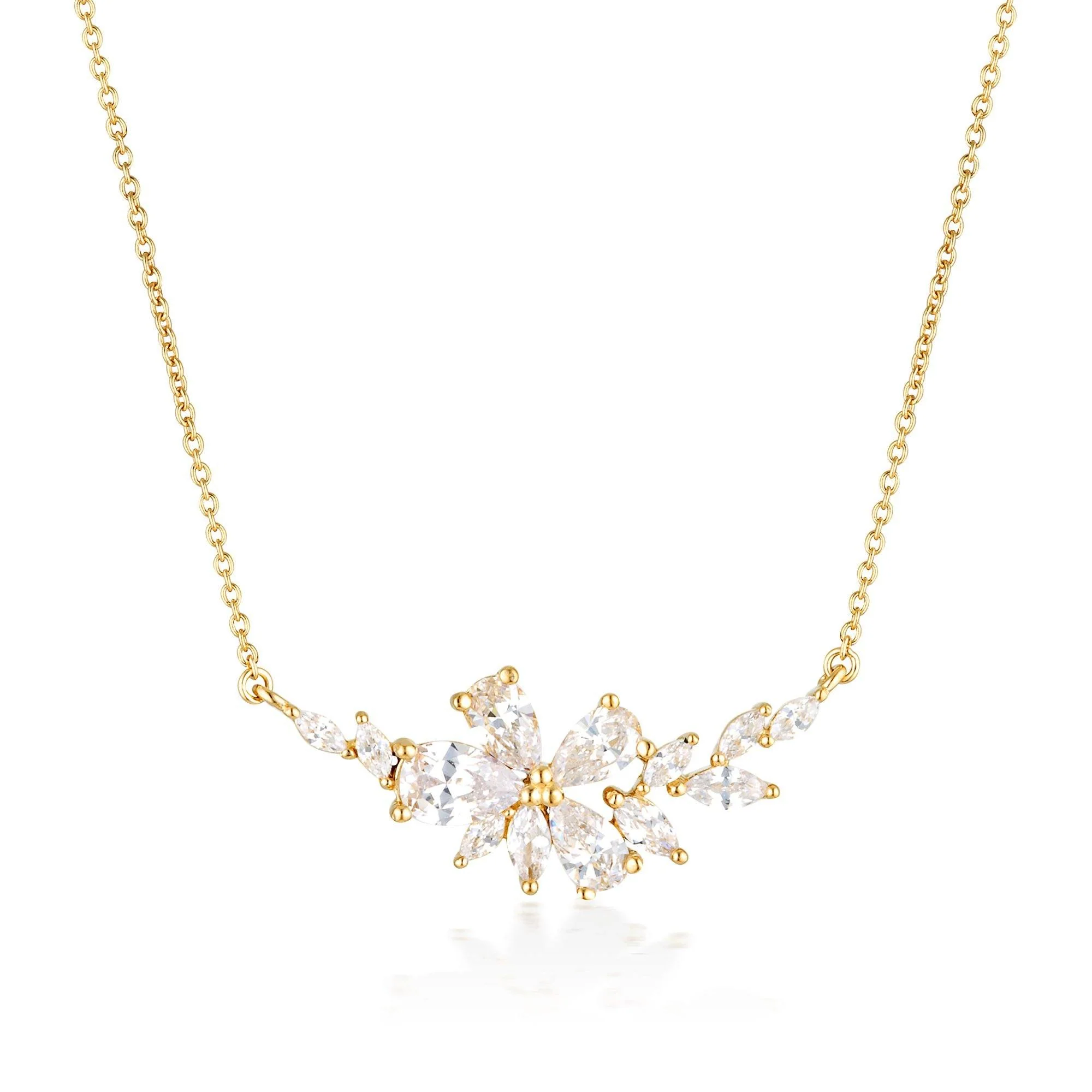 Bloom in Hyacinth by Georgini. This sparking floral inspired necklace combines beautifully cut pear and marquise cubic zirconia’s to create the most stunning of bridal pieces. Pair with the Hyacinth earrings for efflorescent sparkle and shine. Crafted in 18ct Gold plated 925 Sterling Silver this pendant measures approximately 26.3mm long by 12mm high and sits on a 41cm chain with a 5cm extension.