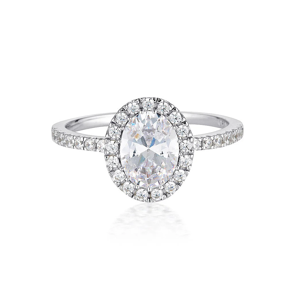 The Oval Halo ring – a feminine, royal design with endless possibilities. This gorgeous ring features a luminous oval cut cubic zirconia surrounded by pave set stones and a half set pave band. The look is contemporary glamour that never goes out of style. Style it with the matching Oval halo earrings and pendant.