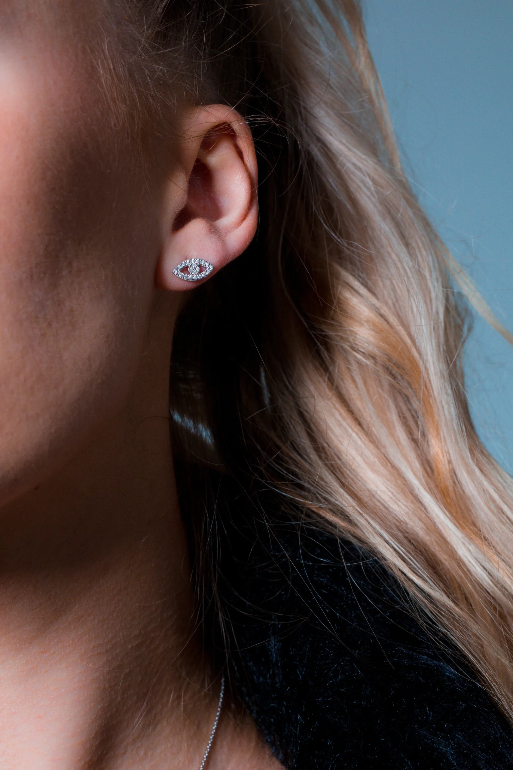 The Evil Eye earrings in Silver by Georgini are a fashion edit on the ancient symbol for protection from negative energy. Subtle and sleek these earrings feature 22 sparkling stones perfectly set into this beautiful talisman. Team it with the Evil Eye bracelet and pendant for an on trend set this season. Crafted in luxurious rhodium plated Sterling Silver they measure approximately 10mm by 5mm.