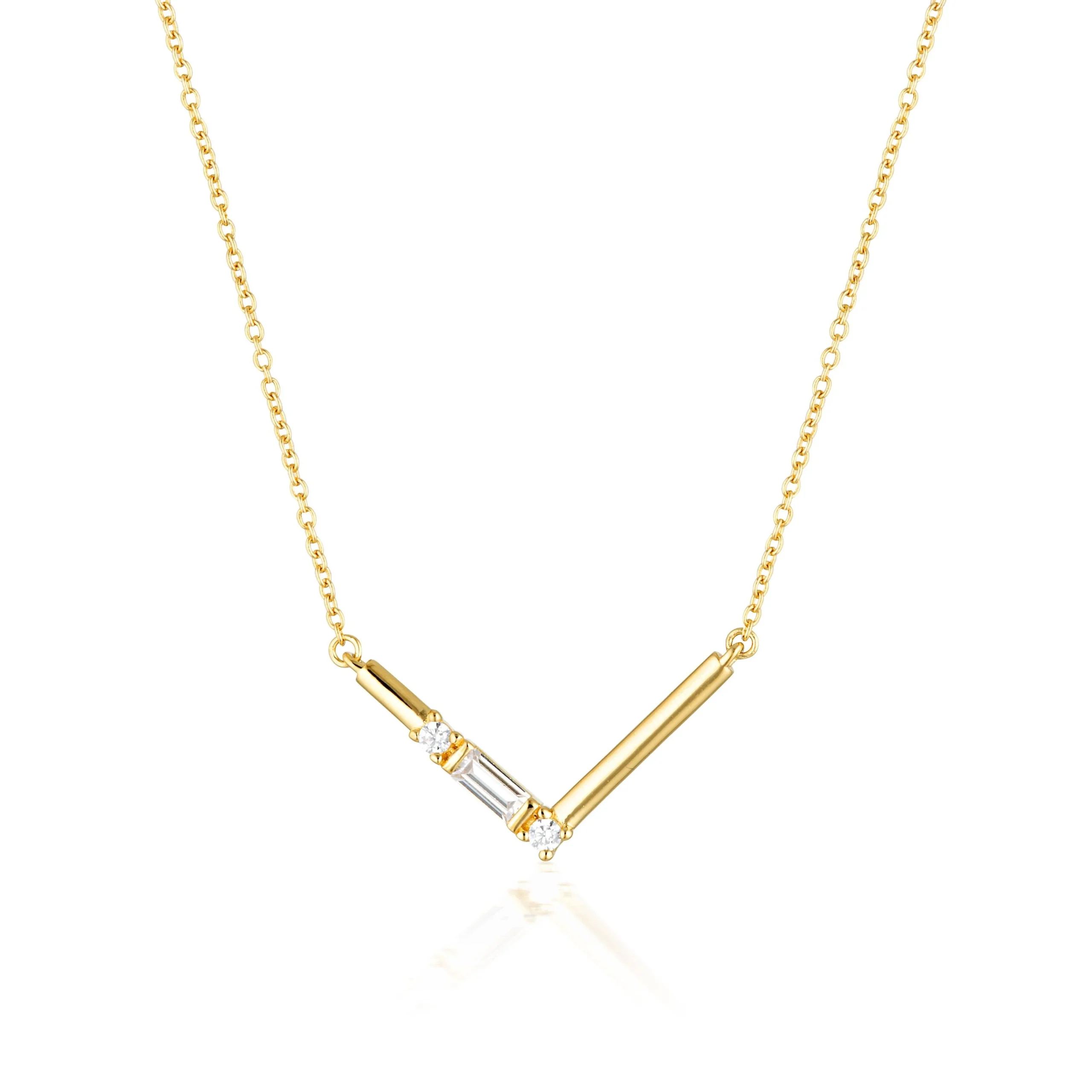 | The TIGA Necklace by GEORGINI is a modern and beautiful designed simple V-shaped pendant. It features the brilliant baguette stone trilogy featured throughout THE LAYERED EDIT, so you can combine it with other styles from this edit and create a fabulous layered look. Crafted in 18ct Gold plated 925 Sterling Silver, the necklace measures approximately 41cm with a 5cm extension. |