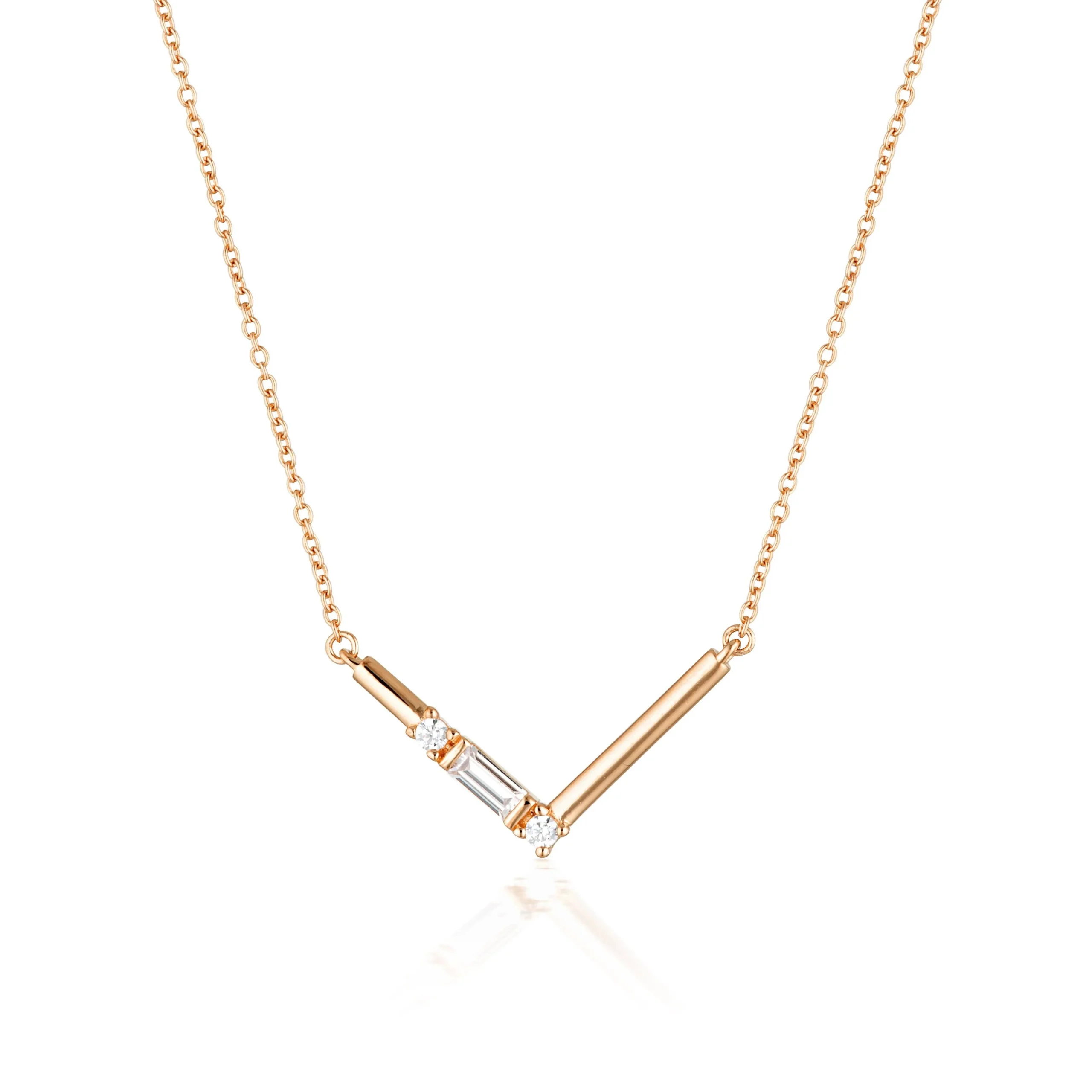 | The TIGA Necklace by GEORGINI is a modern and beautiful designed simple V-shaped pendant. It features the brilliant baguette stone trilogy featured throughout THE LAYERED EDIT, so you can combine it with other styles from this edit and create a fabulous layered look. Crafted in 18ct Rose Gold plated 925 Sterling Silver, the necklace measures approximately 41cm with a 5cm extension. |