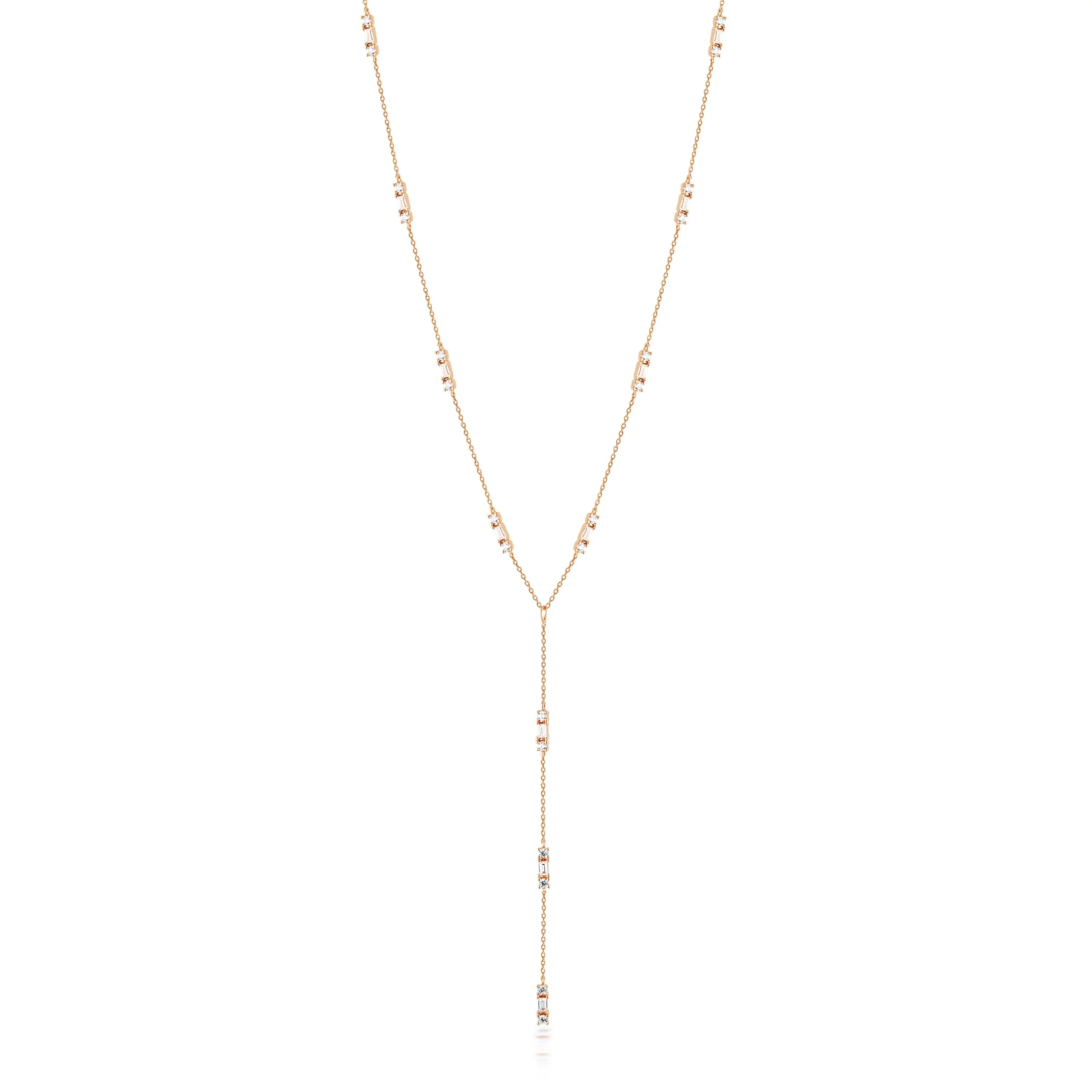 The Tolu Lariat necklace by GEORGINI is a stunning featuring finale piece for any layered look. With a modern linear luxury feel, it features a sparkling trilogy of brilliant and baguette-cut stones. The chain measures approximately 41cm with a 5cm extension and has a 9cm drop. Crafted in 18ct Rose Gold plated 925 Sterling Silver.