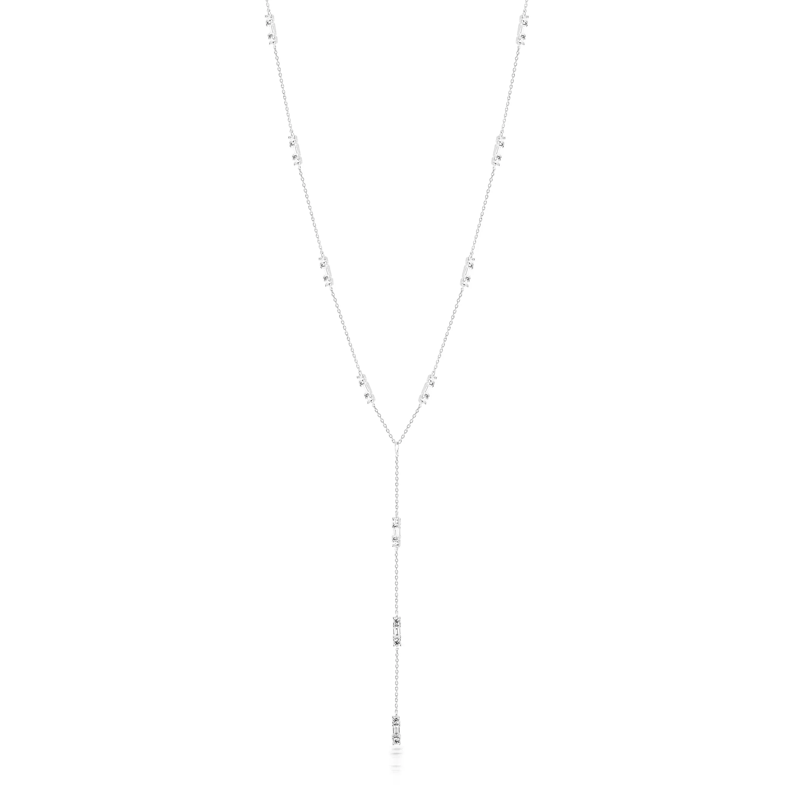 The Tolu Lariat necklace by GEORGINI is a stunning featuring finale piece for any layered look. With a modern linear luxury feel, it features a sparkling trilogy of brilliant and baguette-cut stones.  The chain measures approximately 41cm with a 5cm extension and has a 9cm drop. Crafted in Rhodium plated 925 Sterling Silver.