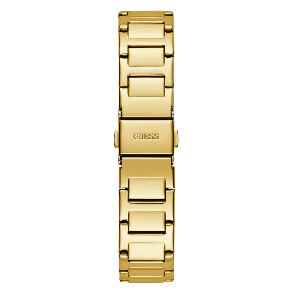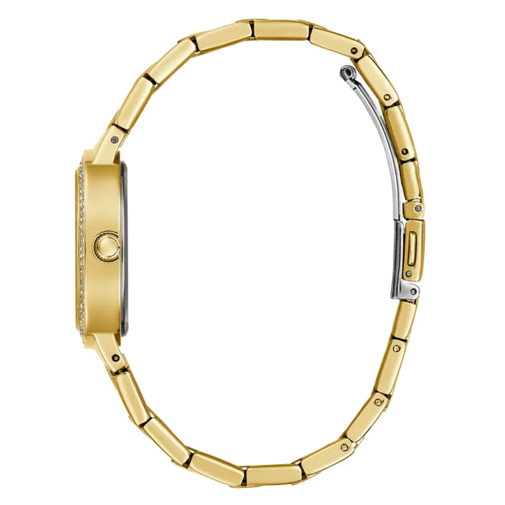 Floral details paired with a unique case design featuring a double row of crystals gives the look an ultra-feminine touch and is paired effortlessly with a sleek integrated bracelet design.