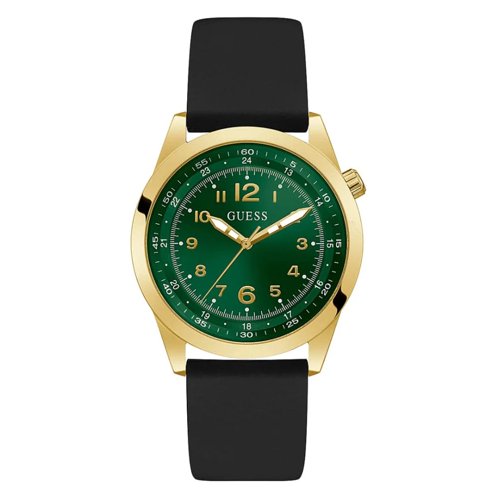 A classic dress look with sport appeal. This watch features a unique dial with outer ring tachymeter design details and bold Arabic numbers for easy time telling silicone strap.