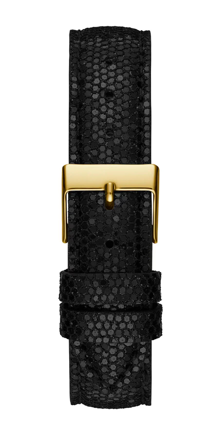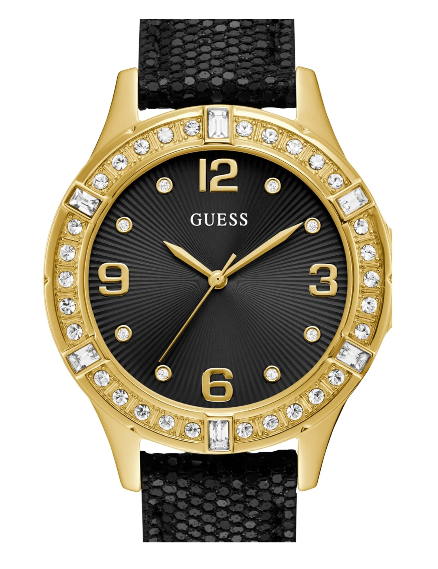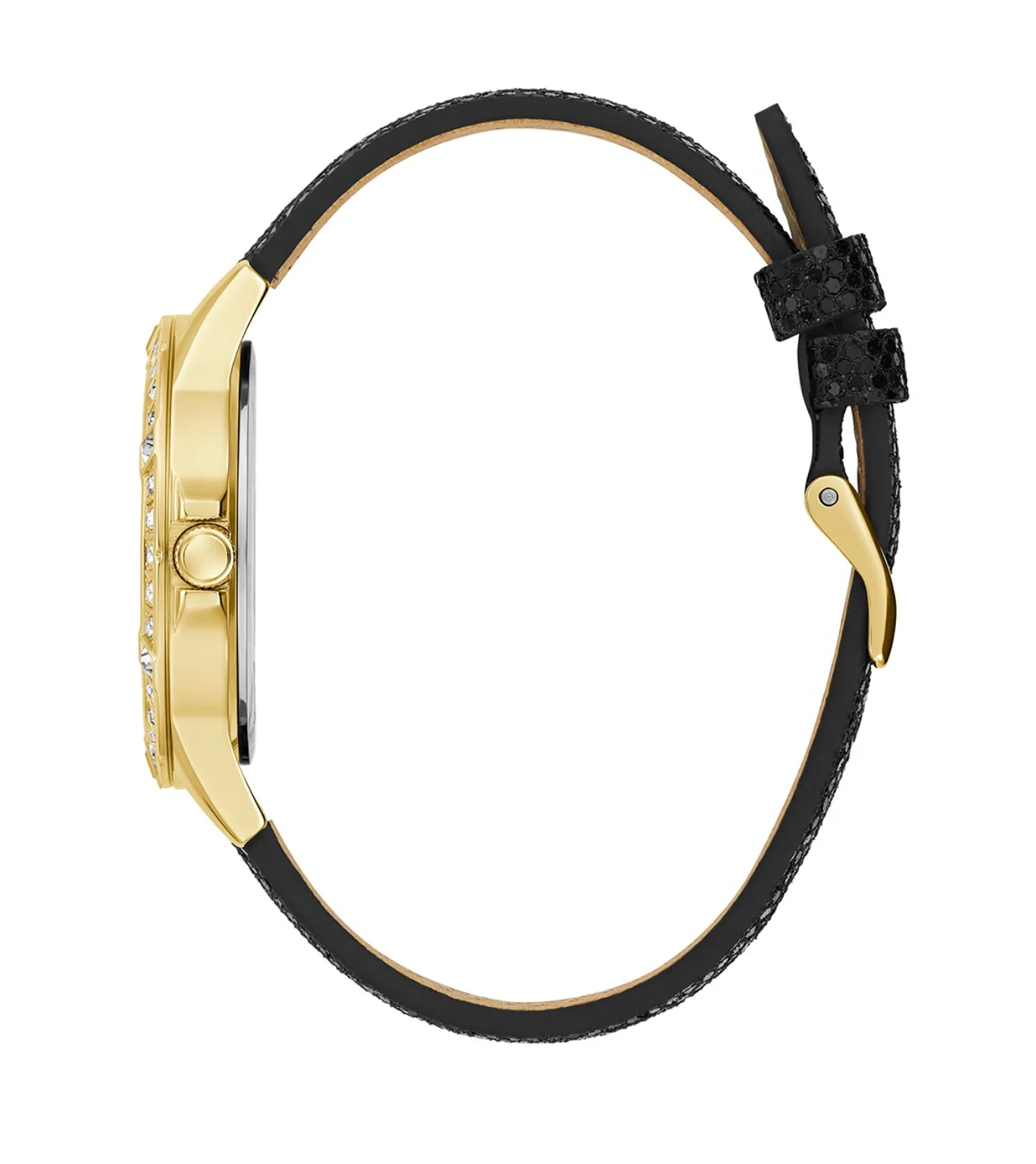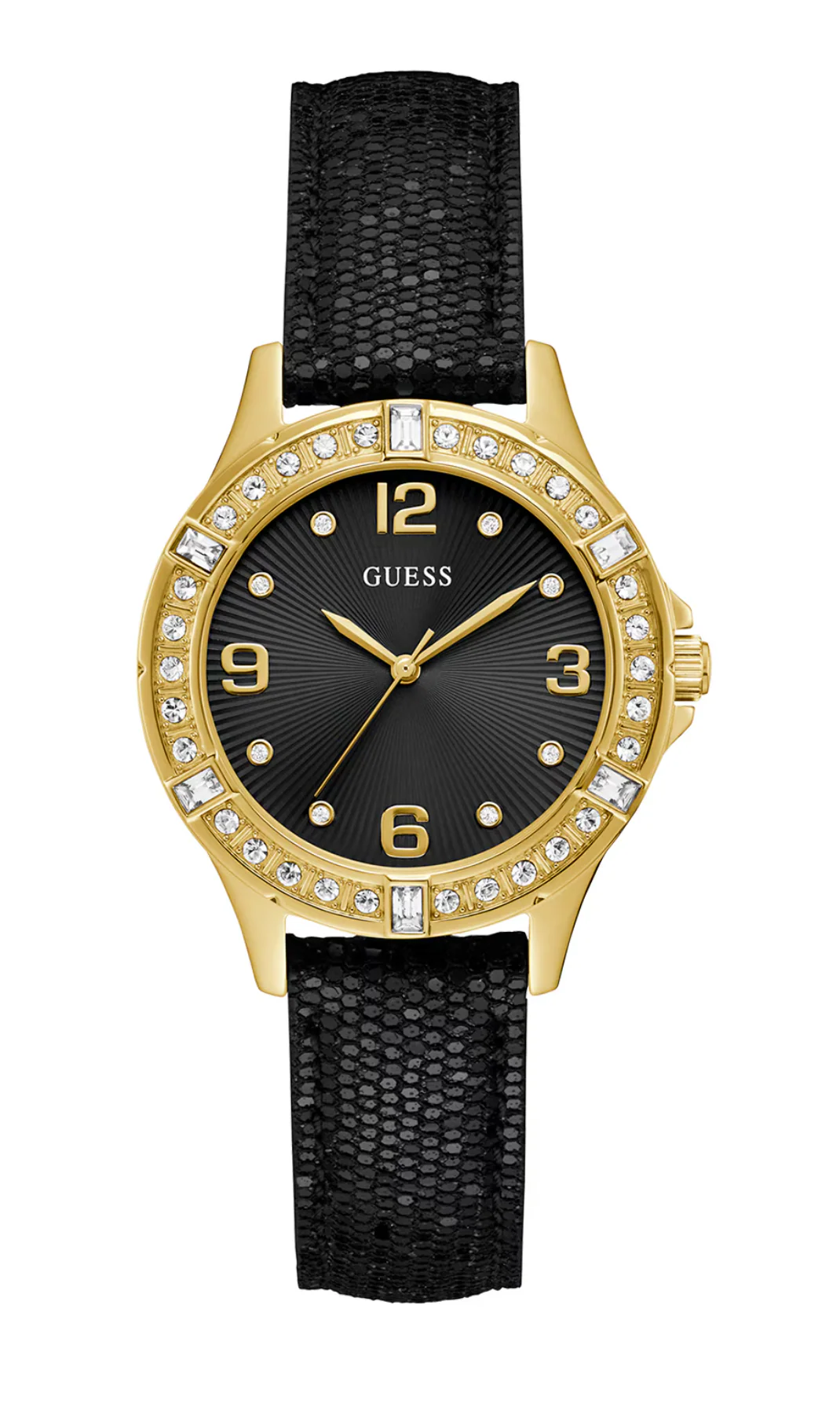 Refined elegance meets modern design in the Guess Black Dial and Leather Strap Gold Case Watch U1353L1M. Designed for women who appreciate luxury in everyday wear, this timepiece showcases a radiant gold-tone stainless steel case, paired with a textured black leather strap that adds depth and sophistication. The 36mm round case frames a sleek black dial accented with luminous crystal hour markers and gold-tone Arabic numerals, balancing glamour with clarity. An analog quartz movement ensures reliable performance, while the mineral crystal glass provides durability. With a water resistance of 30 meters and a comfortable strap buckle closure, this women’s watch seamlessly blends fashion with function. Perfect for any occasion, it adds a polished finish to both casual and formal looks.
