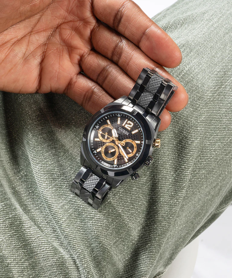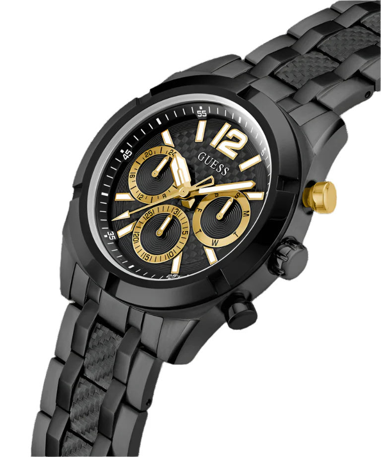 The Guess Black Dial Black Tone Multi-function Watch GW0714G4 is meticulously crafted for those who appreciate bold elegance and reliable performance. Featuring a striking black dial with refined gold accents and multi-function subdials, this men’s watch combines modern sophistication with enduring versatility. The robust 44mm recycled steel case and matching black IP bracelet ensure both durability and comfort, while the pilot buckle closure adds a secure, premium touch. Water resistant up to 50 meters, this timepiece is designed to complement any style, from refined businesswear to casual attire. With exceptional craftsmanship and a contemporary edge, it is a standout accessory for any collection.