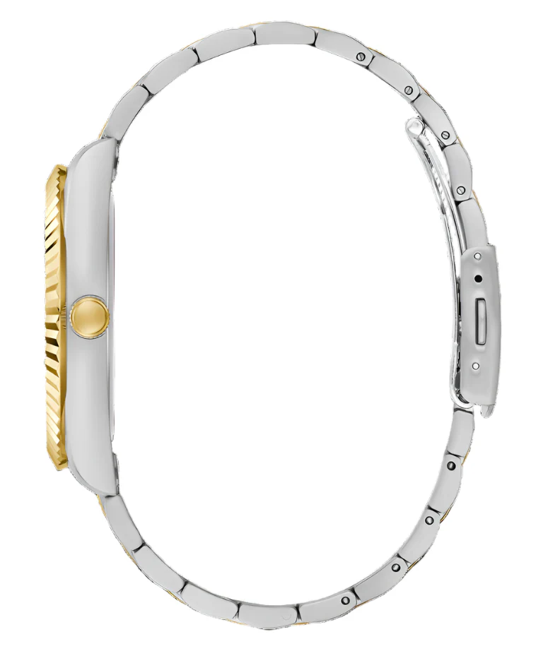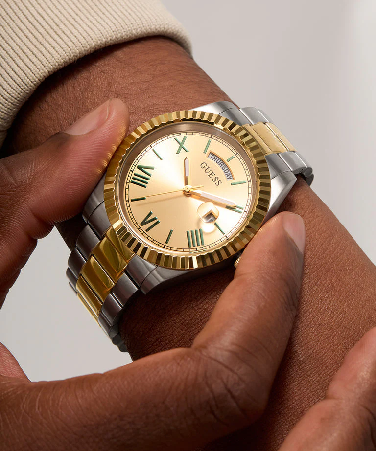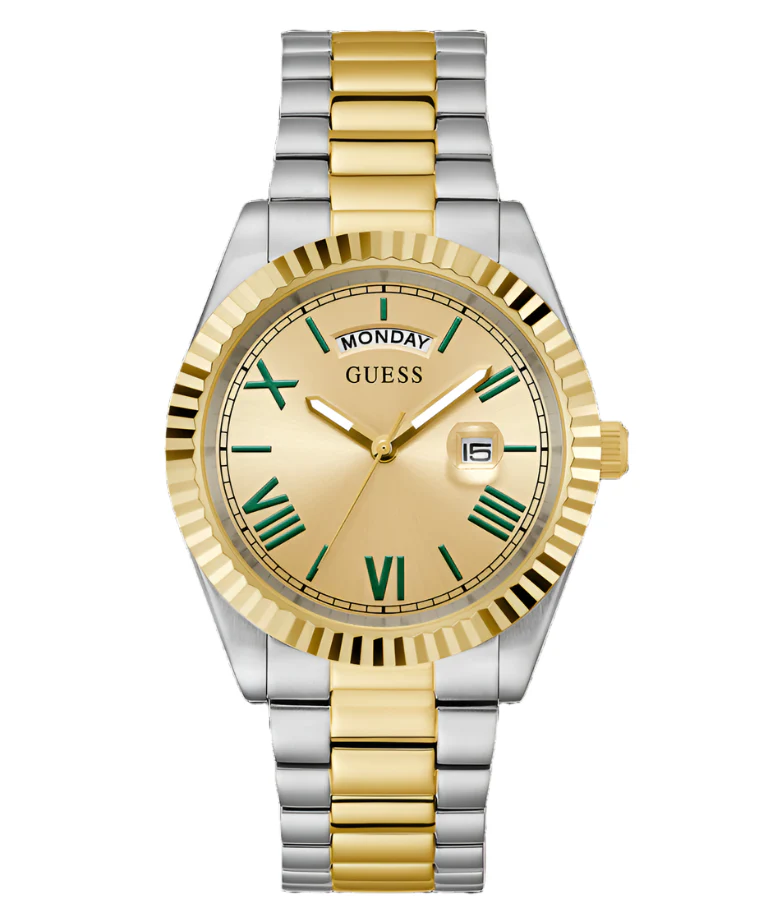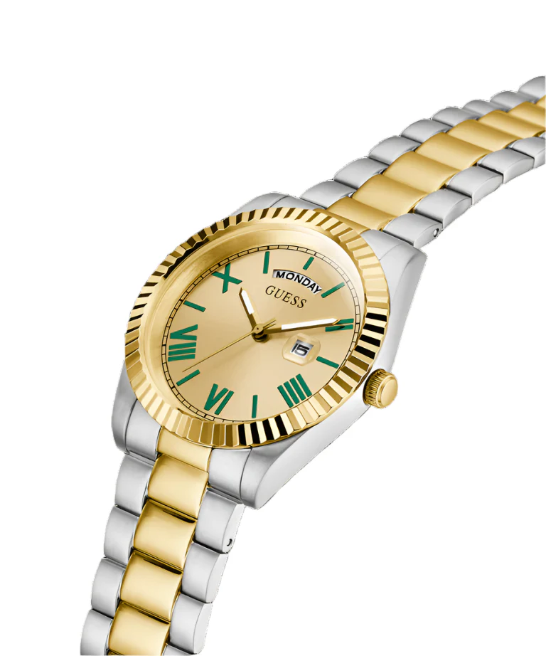 Refined and timeless, the Guess CONNOISSEUR Champagne Dial Two Tone Stainless Steel Watch GW0265G14 is a distinguished men’s watch crafted for those who appreciate classic elegance. The champagne dial, accented by green Roman numerals, adds a distinctive touch of sophistication, while the polished two-tone stainless steel bracelet and case exude luxury. A 42mm case size and mineral crystal glass offer both presence and durability, complemented by water resistance up to 50 meters. The quartz movement ensures precise timekeeping, with day and date displays enhancing functionality. Perfectly suited for both formal and everyday wear, this watch effortlessly combines recycled steel construction with iconic Guess design heritage to create a standout piece in men’s fashion watches.