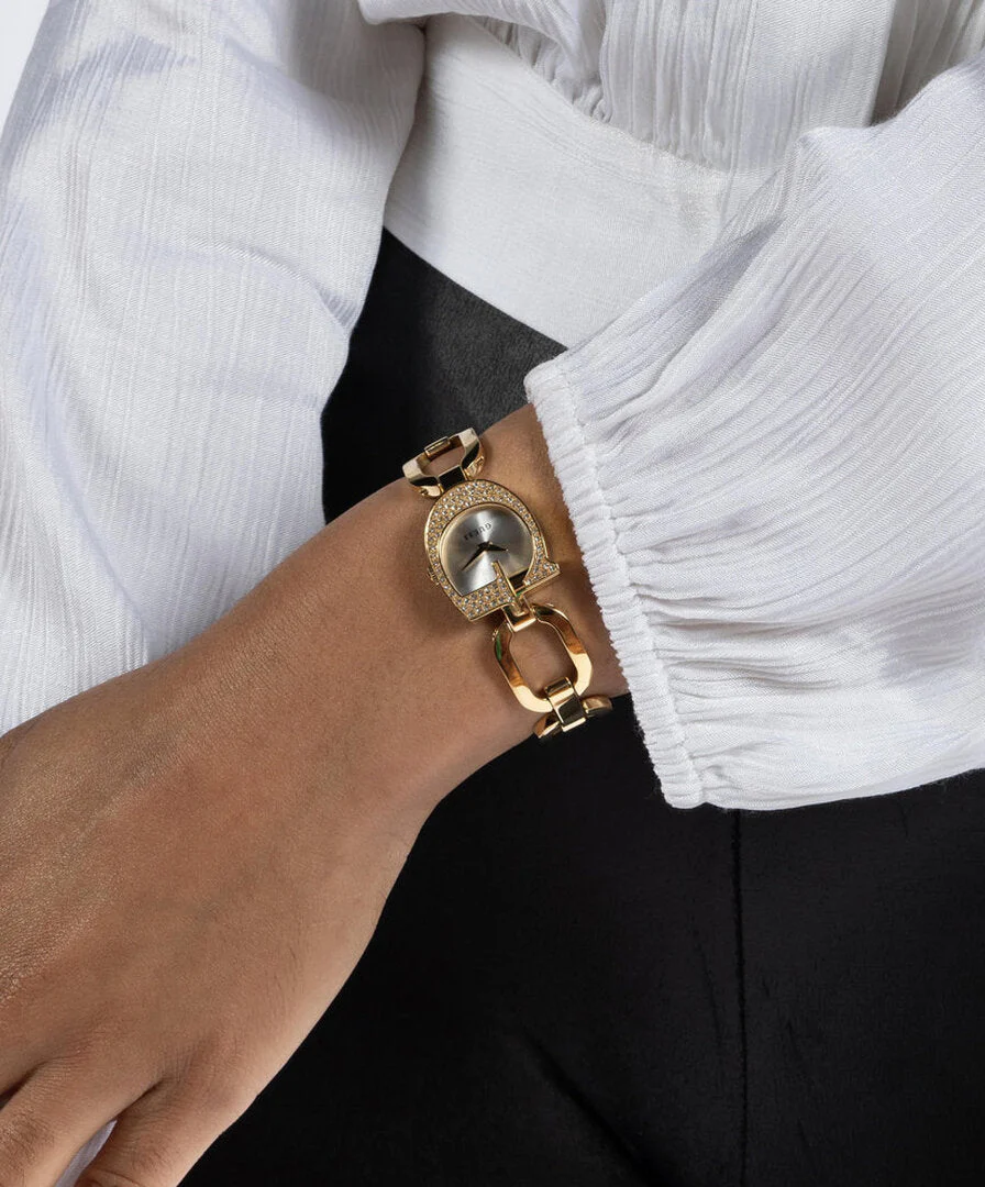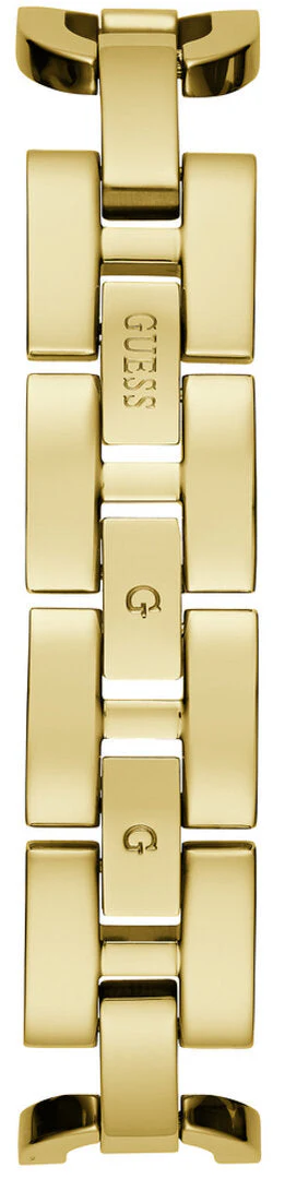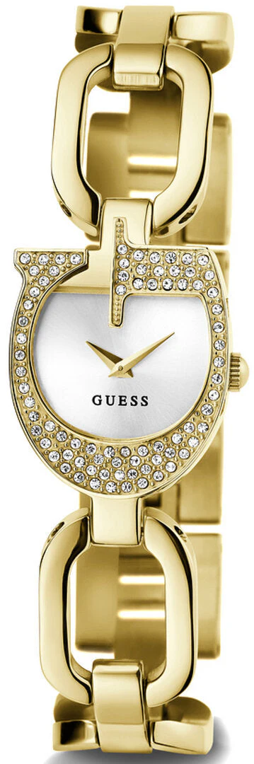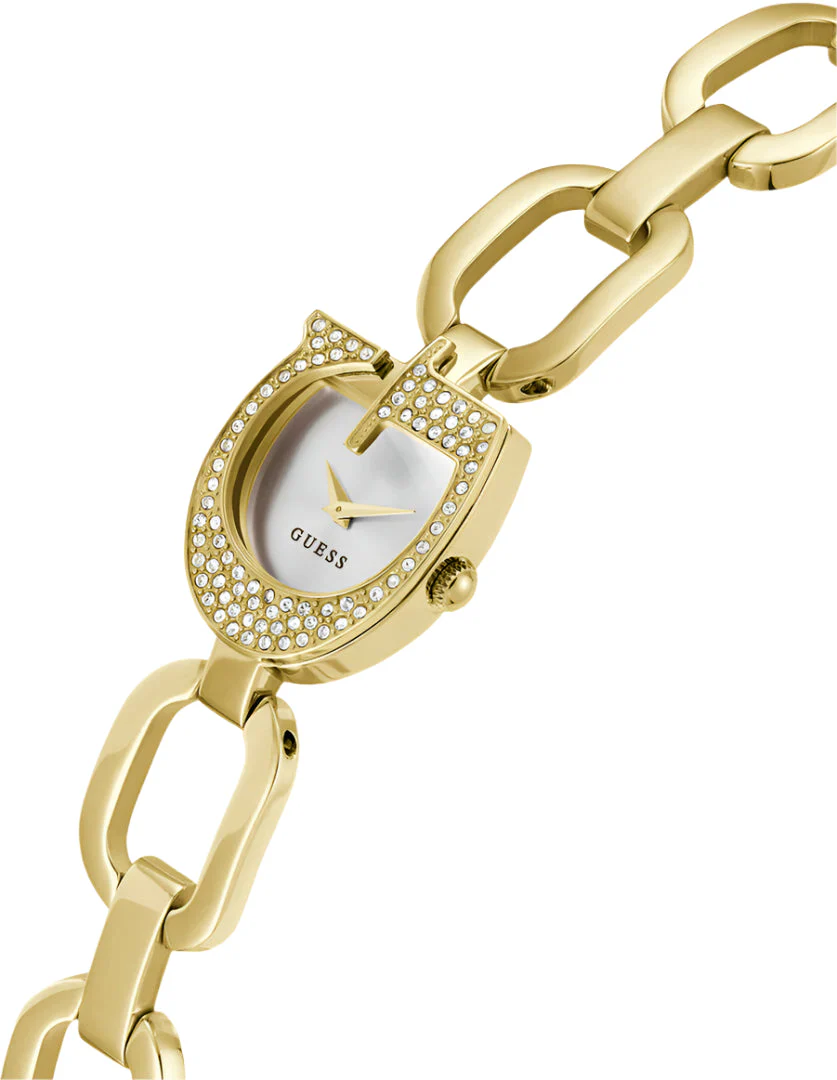 The Guess Gia Silver Dial Gold Stainless Steel Watch GW0683L2 radiates timeless elegance with a modern twist. Showcasing a gold-tone recycled steel band and a unique horseshoe-shaped 22mm case embellished with sparkling crystals, this women’s watch strikes the perfect balance between statement piece and refined accessory. The sleek silver dial, protected by durable mineral crystal glass, is framed for a striking contrast, while the reliable quartz analog movement ensures precise timekeeping. Lightweight and comfortable with a secure G-Link closure, this sophisticated timepiece features water resistance up to 30 meters, making it as practical as it is stylish. Elevate your jewelry collection with this standout from Guess, renowned for superior craftsmanship and iconic design.