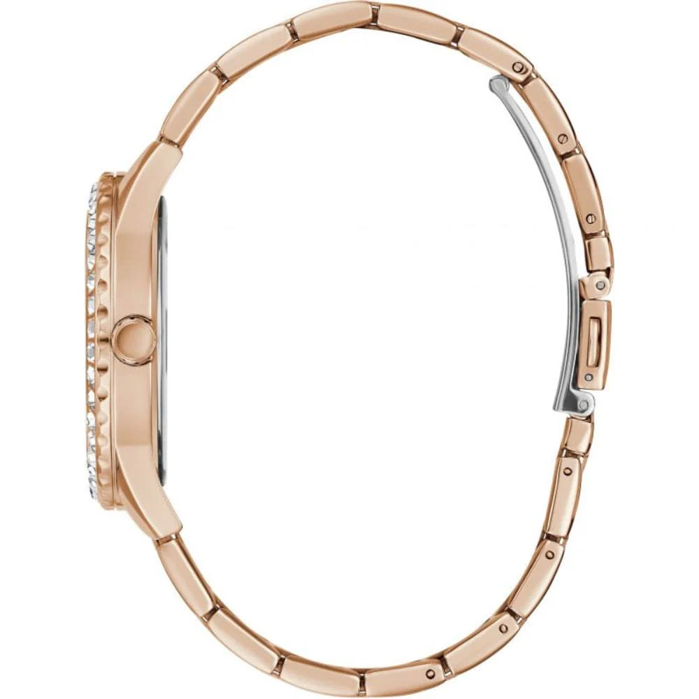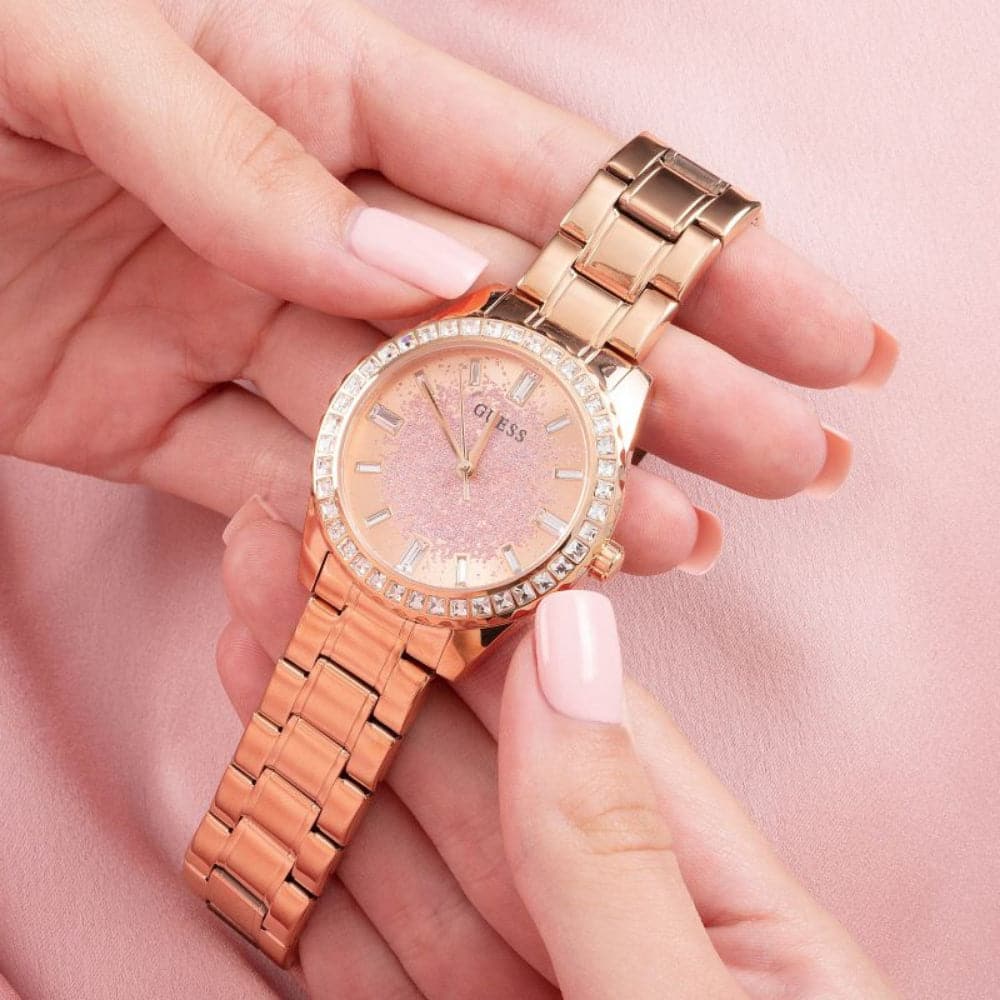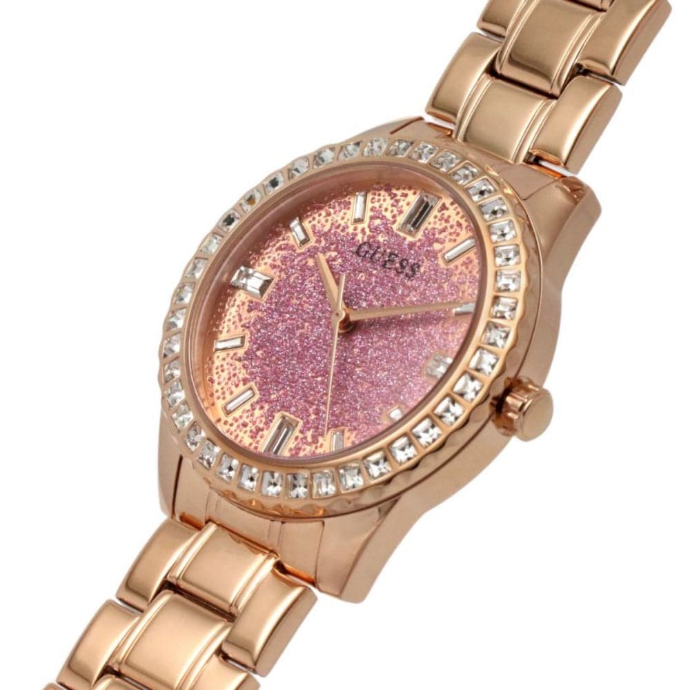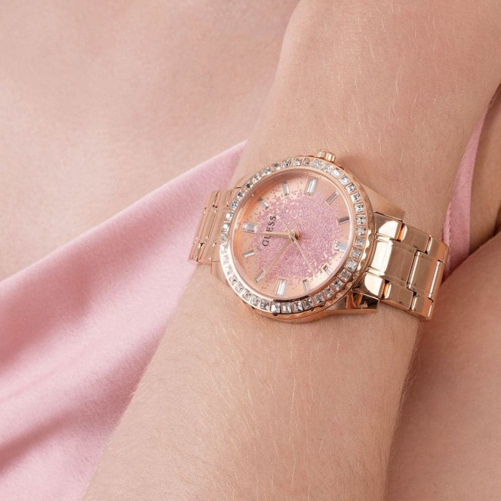 Guess GLITTER BURST GW0405L3 is an incredible eye-catching Ladies watch from NIGHT LIFE collection. Case material is Stainless Steel, which stands for a high quality of the item while the dial color is Rose. 30 meters water resistance will protect the watch and allows it to be worn in scenarios where it is likely to be splashed but not immersed in water. It can be worn while washing your hands and will be fine in rain.
