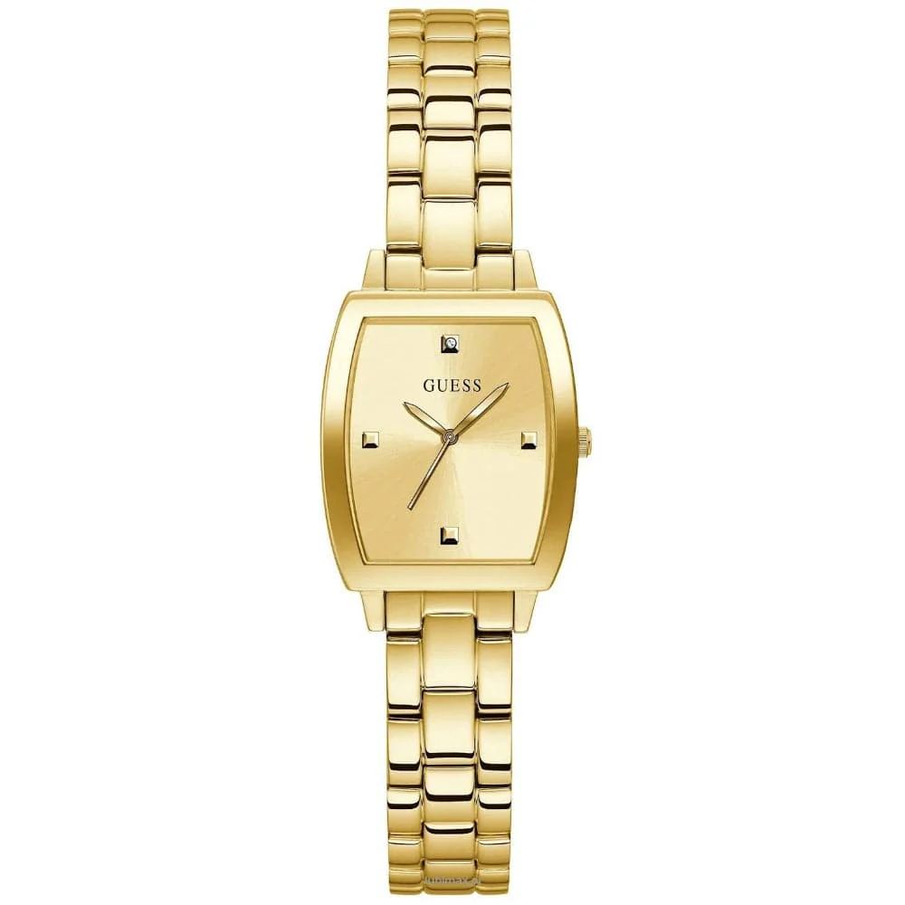 Women’s time only watch from the Guess be loved collection. Time only watch with case made of gold-colored stainless steel with polished finish. Case size: 38 mm. The case is round in shape with crystals. The dial is pink with a sunray finish. The strap is made of gold-colored stainless steel with a polished finish. The closure is with a pilot buckle. The movement is quartz with an analog display. Water resistance is 50 atm. Features: 2h. The reference is GW0384L2