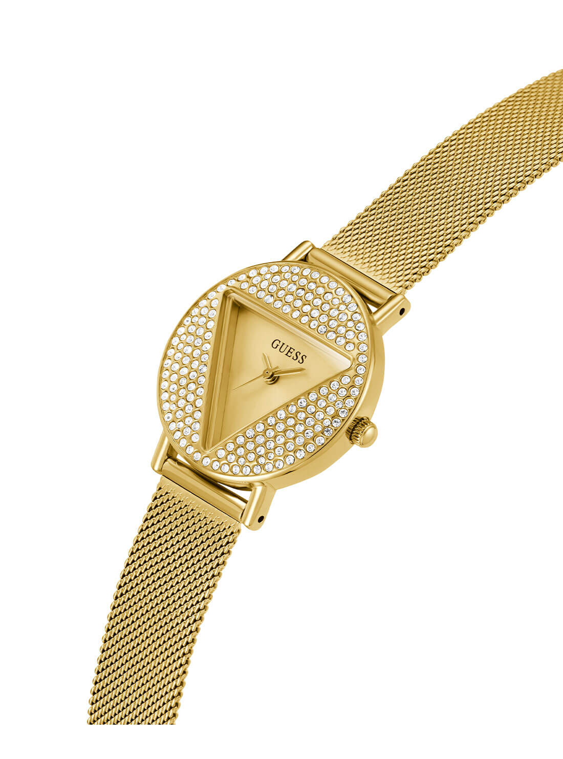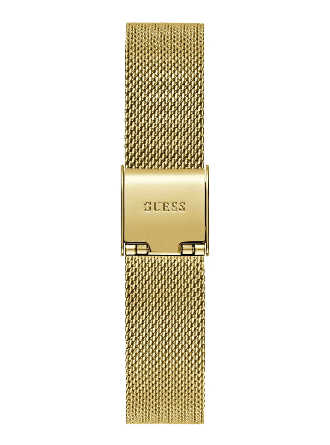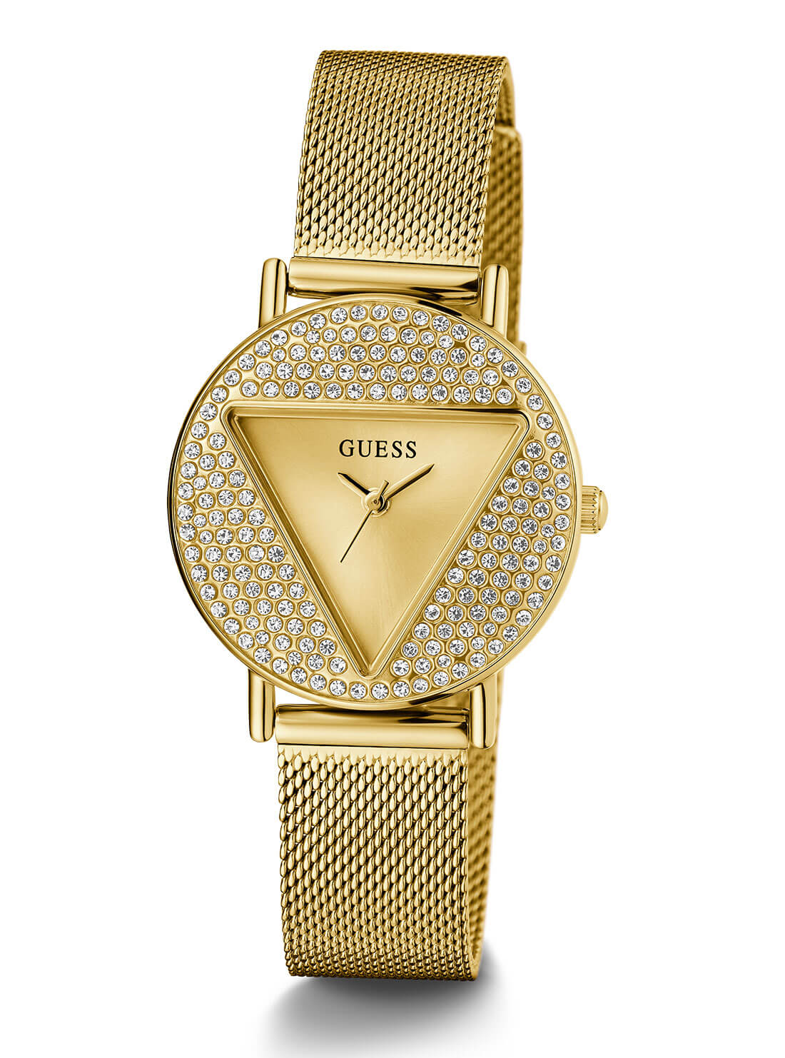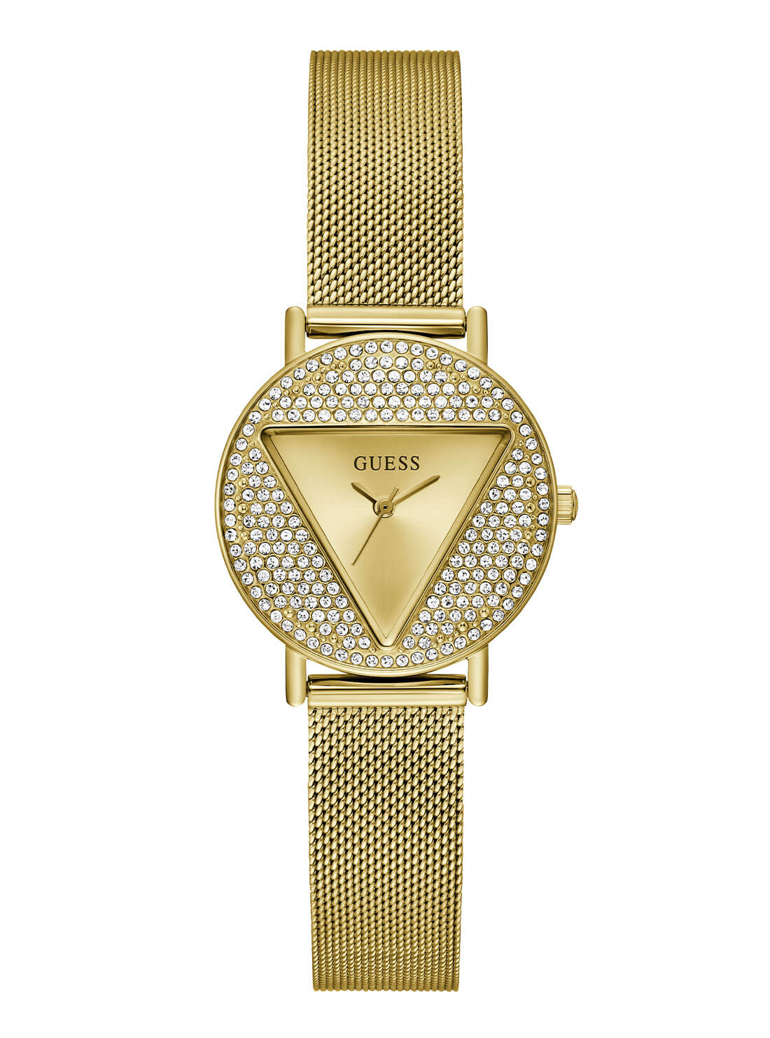 Radiating sophistication, the Guess Mini Gold Iconic Glitz Mesh Watch GW0671L2 for women features a polished recycled stainless steel case with a shimmer of crystals on the bezel, capturing the essence of contemporary luxury. The gold sunray dial beautifully reflects light while the finely woven gold mesh strap ensures both comfort and a refined silhouette. With precise quartz analog movement and water resistance up to 30 meters, this timepiece embodies durability wrapped in elegance. Its 30mm round case and signature Guess design seamlessly elevate any wardrobe, making it the ideal accessory for those seeking style and craftsmanship in the women’s watch category.