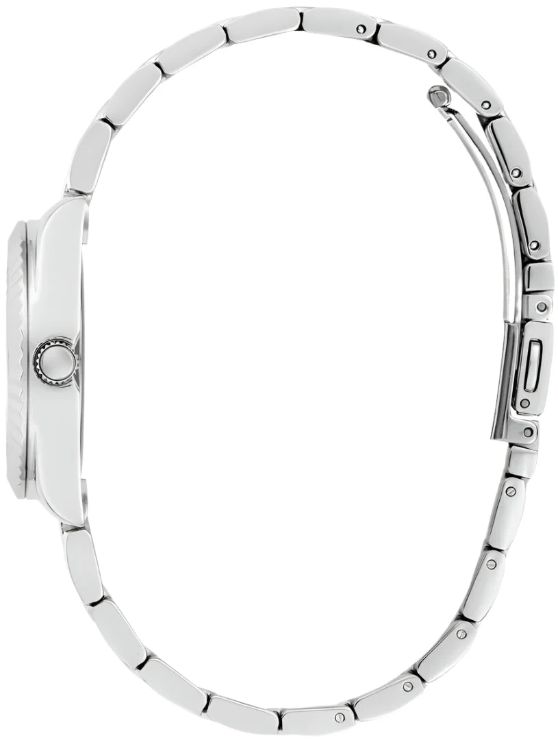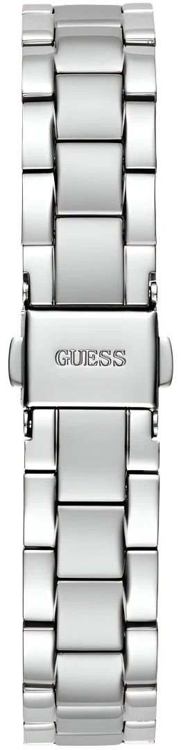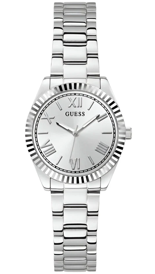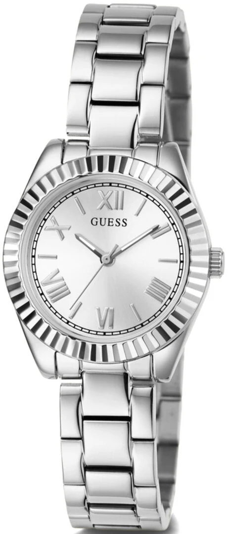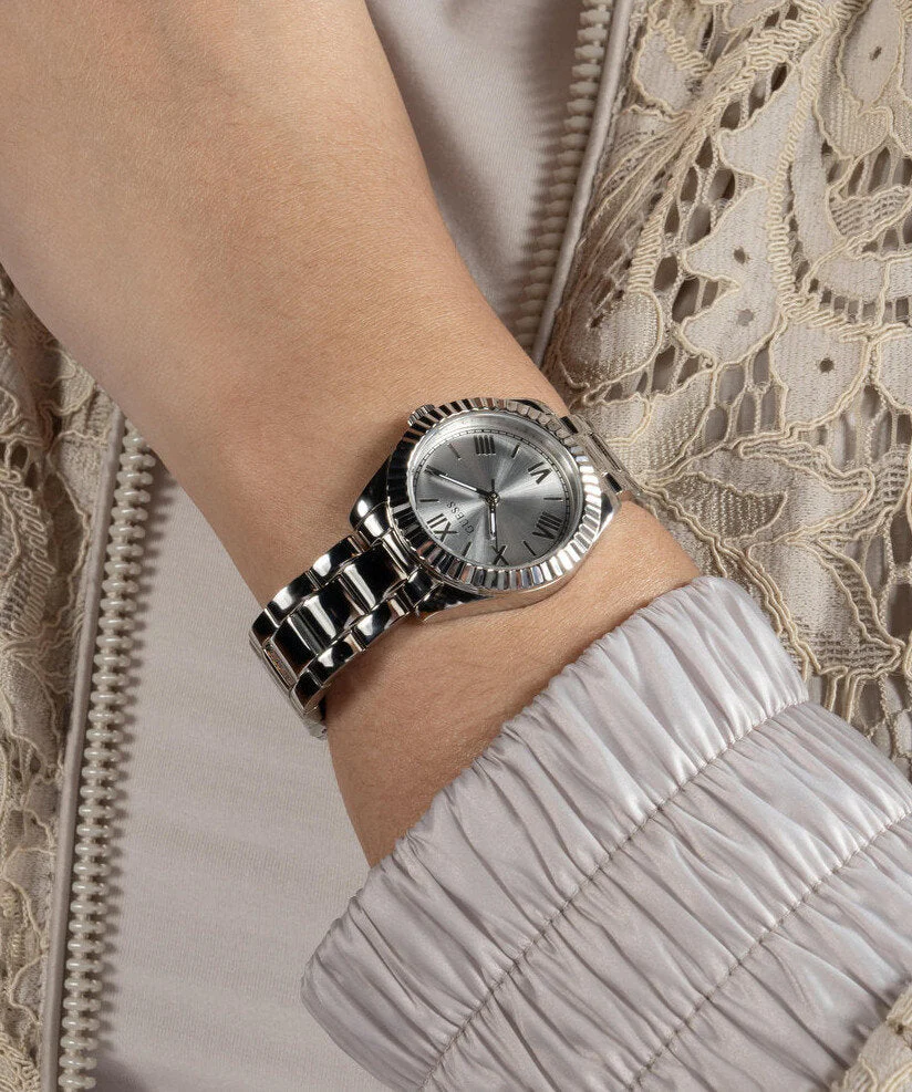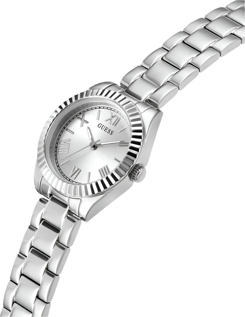 The Guess Mini Luna Silver Dial Stainless Steel Watch GW0687L1 is a refined women’s watch that blends modern elegance with timeless design. Crafted from polished recycled steel, its 30mm round case features a textured bezel and a radiant sunray silver dial with Roman numeral markers for a classic yet contemporary look. The silver-tone stainless steel bracelet with a secure pilot buckle adds durability and comfort, while the mineral crystal glass offers reliable protection. With 30 meters of water resistance and precise quartz movement, this timepiece balances sophistication and everyday functionality. Ideal for both workwear and evening ensembles, it’s a statement piece in the women’s watch category.