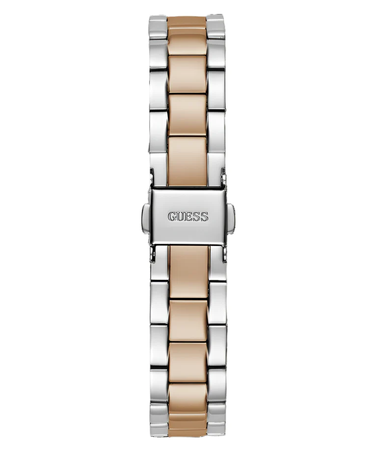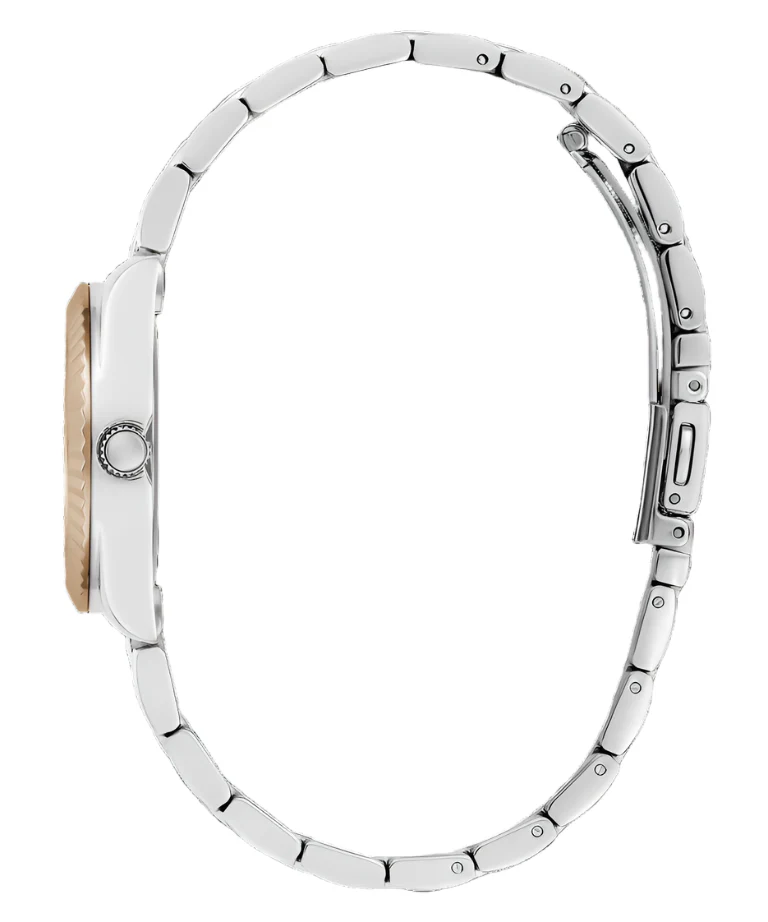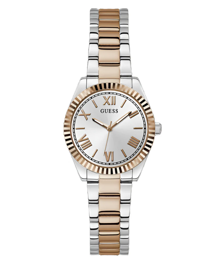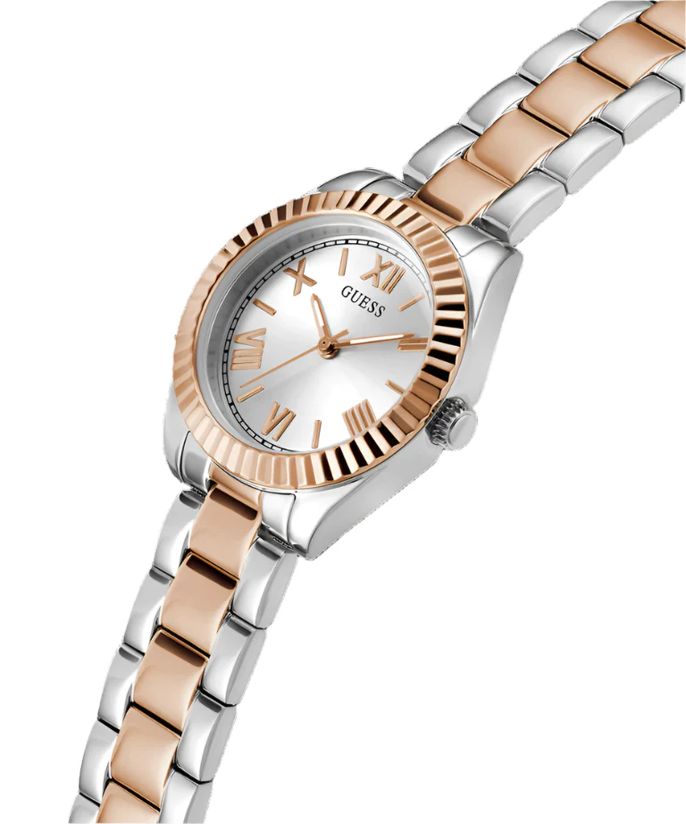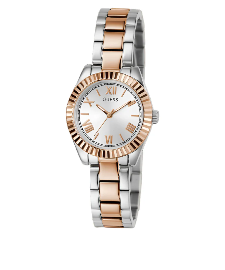 The Guess Mini Luna women’s watch features a polished silver dial with Roman numeral accents, beautifully framed by a compact 30mm recycled steel case and mineral crystal glass for everyday durability. Its two-tone stainless steel bracelet, combining rose gold and silver, offers a sophisticated touch that transitions seamlessly from day to night. Precise quartz movement and water resistance up to 30 meters enhance its practicality, making this piece an essential choice for anyone seeking timeless style in women’s watches. Crafted with attention to detail, the Mini Luna embodies contemporary elegance and the signature quality of Guess in jewelry and watches.