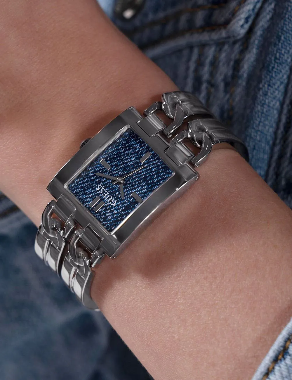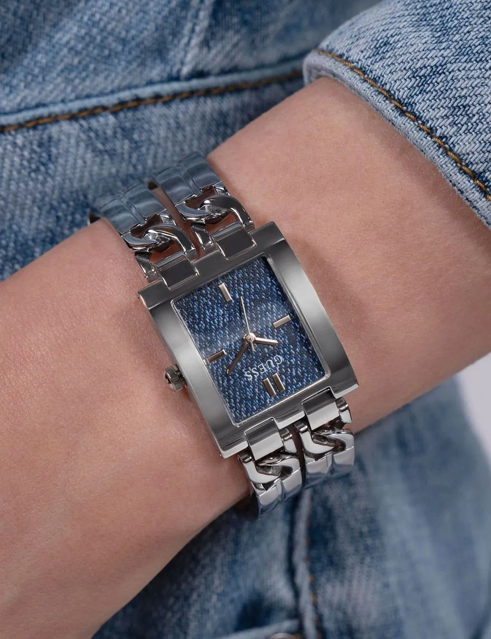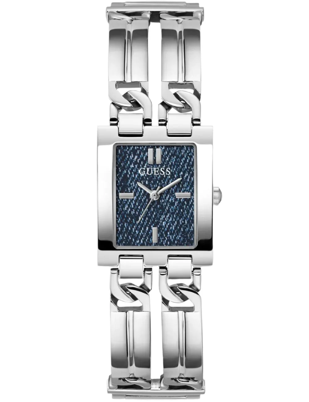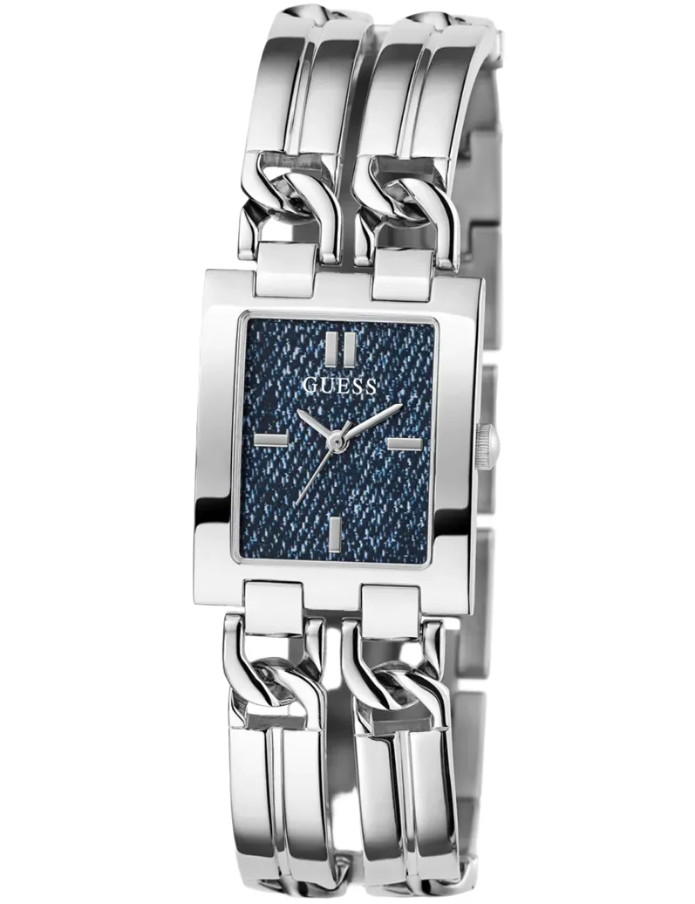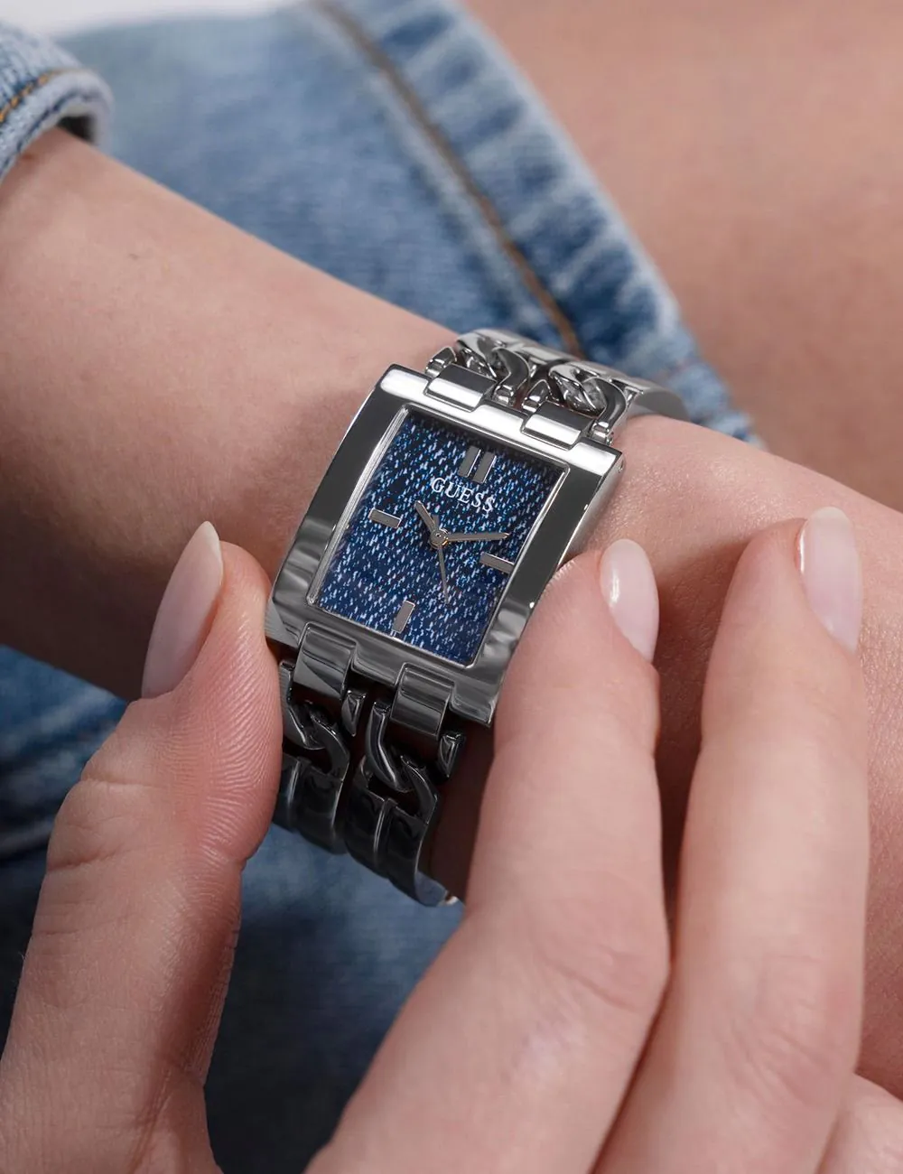 This Guess MOD ID Blue Dial Stainless Steel Watch exudes refined sophistication with a polished silver-tone stainless steel case and bracelet, delivering a harmonious blend of modern elegance and enduring design. The vivid blue dial, shielded by mineral crystal glass, stands out with luminous hands that offer clarity in any light, all framed by a sleek rectangular silhouette. With a delicate 24 mm case size and reliable quartz movement, this women’s watch from Guess ensures lasting precision and everyday versatility. Water-resistant up to 30 meters, it is perfect for those seeking style, durability, and confidence in a premium jewelry timepiece.