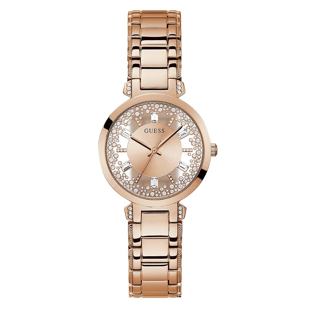 Sweet and sophisticated, this silhouette features a see-thru dial with quattro G pattern design at the 6 o clock hour and a fully crystal bezel with a t bar connection to its chic polished bracelet