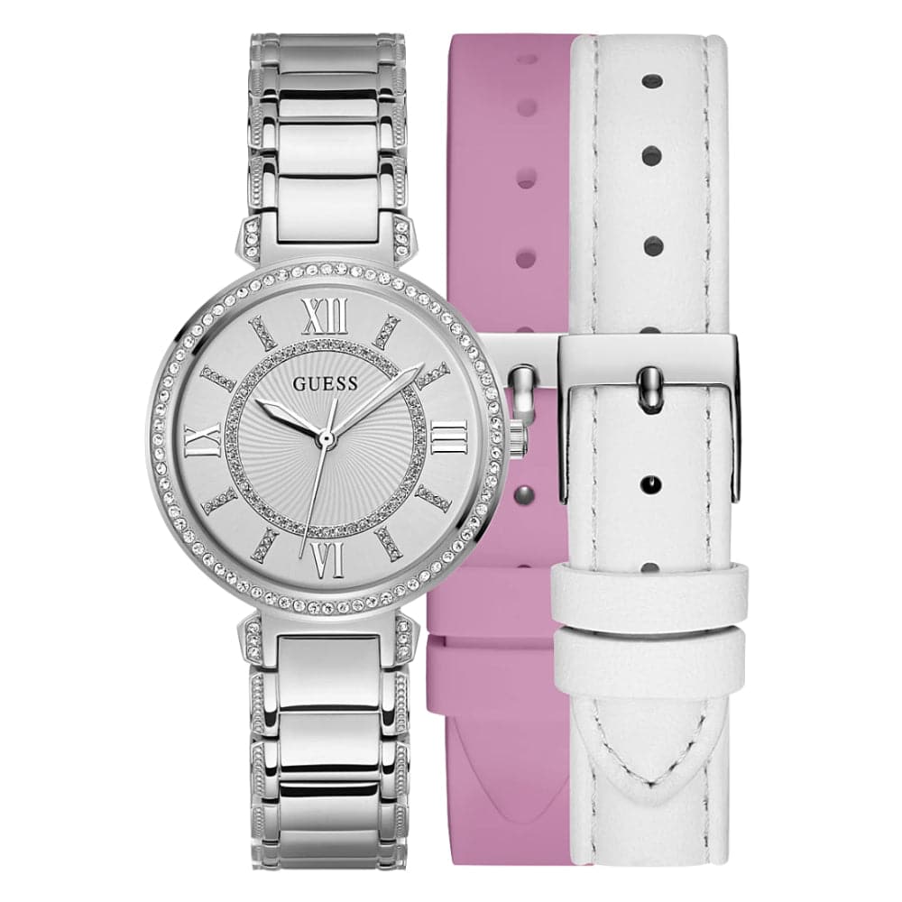 A watch wardrobe that gives you the versatility of a bracelet, silicone strap as well as an ethically sourced leather with ultra-suede backing that are all interchangeable on this great fully glitz crystal look with a dressed up 3H dial. This style ships in packaging.