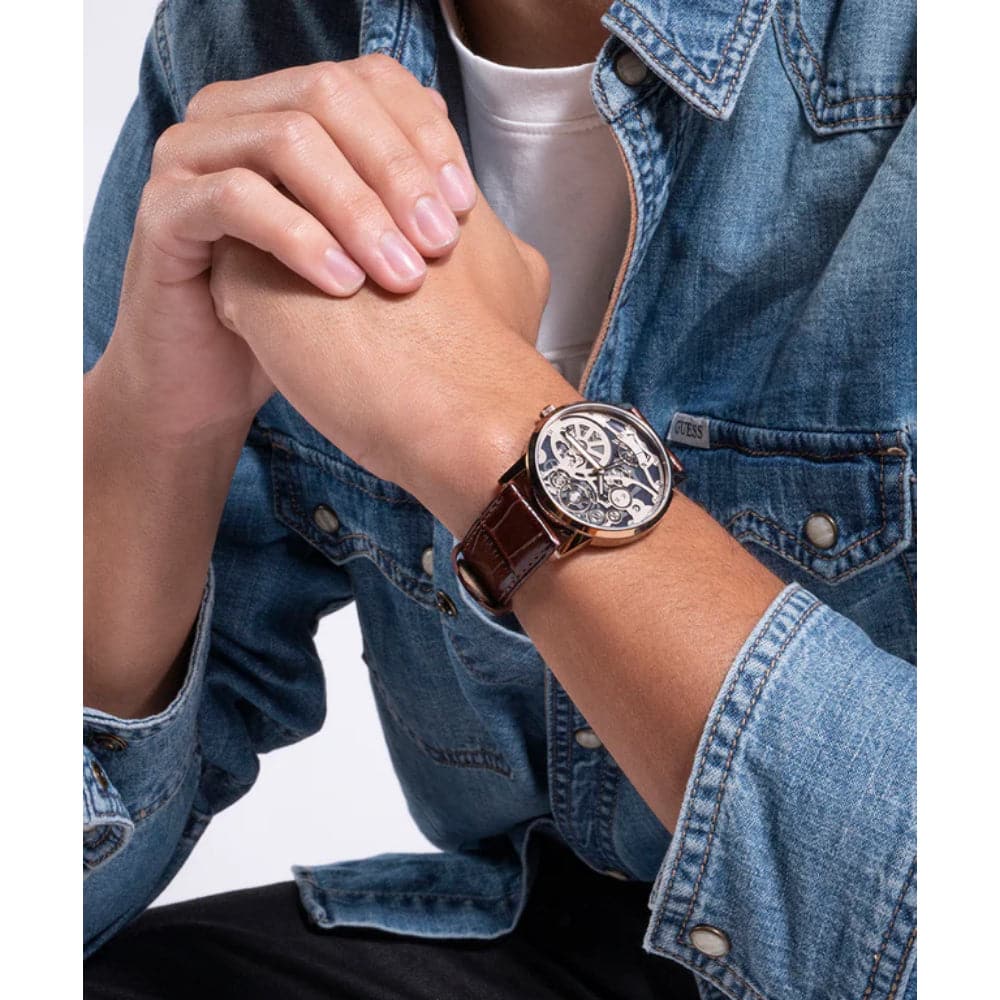 Elevated design details give this style a classic look while incorporating the trend details of automatic gear details. Featuring an ethically sourced croco-embossed leather strap with an ultra-suede backing.
