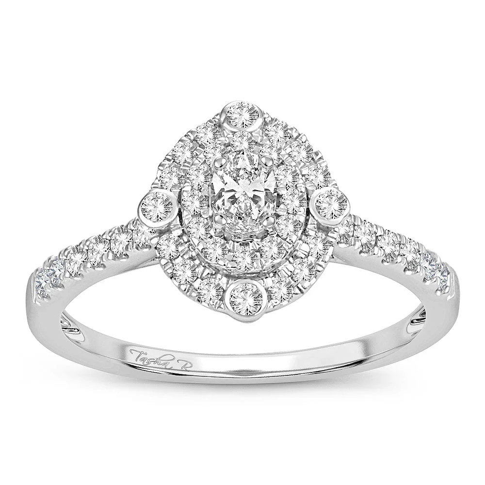 Ariel’s Jewelry is proud to showcase the Halo Elegance, a captivating 14K white gold engagement ring, adorned with a total of 0.50 carats of diamonds. This ring features a central diamond surrounded by a halo of smaller diamonds, creating a dazzling effect that exudes sophistication and glamour.