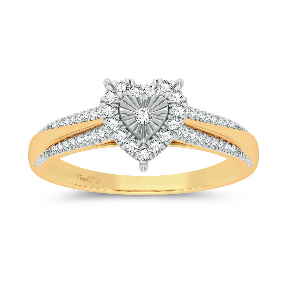 Introducing “Heart’s Whisper,” a delicate 0.15 carat total weight diamond ring crafted in lustrous 10K yellow gold. This ring is an embodiment of love and finesse, featuring a heart-shaped diamond centerpiece that is both captivating and endearing. The heart motif, a timeless symbol of affection, is perfectly complemented by the sparkling halo that surrounds it.