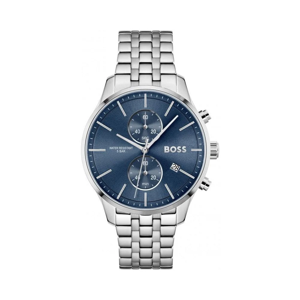 Sleek and sophisticated men’s Hugo Boss watch. Crafted with stainless steel, featuring a silver strap and a striking blue dial with silver hands.