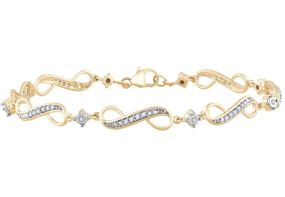 Unveiling our Infinity Loop Diamond Bracelet, a testament to timeless grace and sophistication. This exquisite piece, crafted from lustrous 10k yellow gold, features a sequence of infinity symbols, each loop gently hugging a cluster of scintillating diamonds. Representing endless love and limitless possibilities, this bracelet is a product of over 30 years of curated expertise, chosen for its impeccable quality and value.