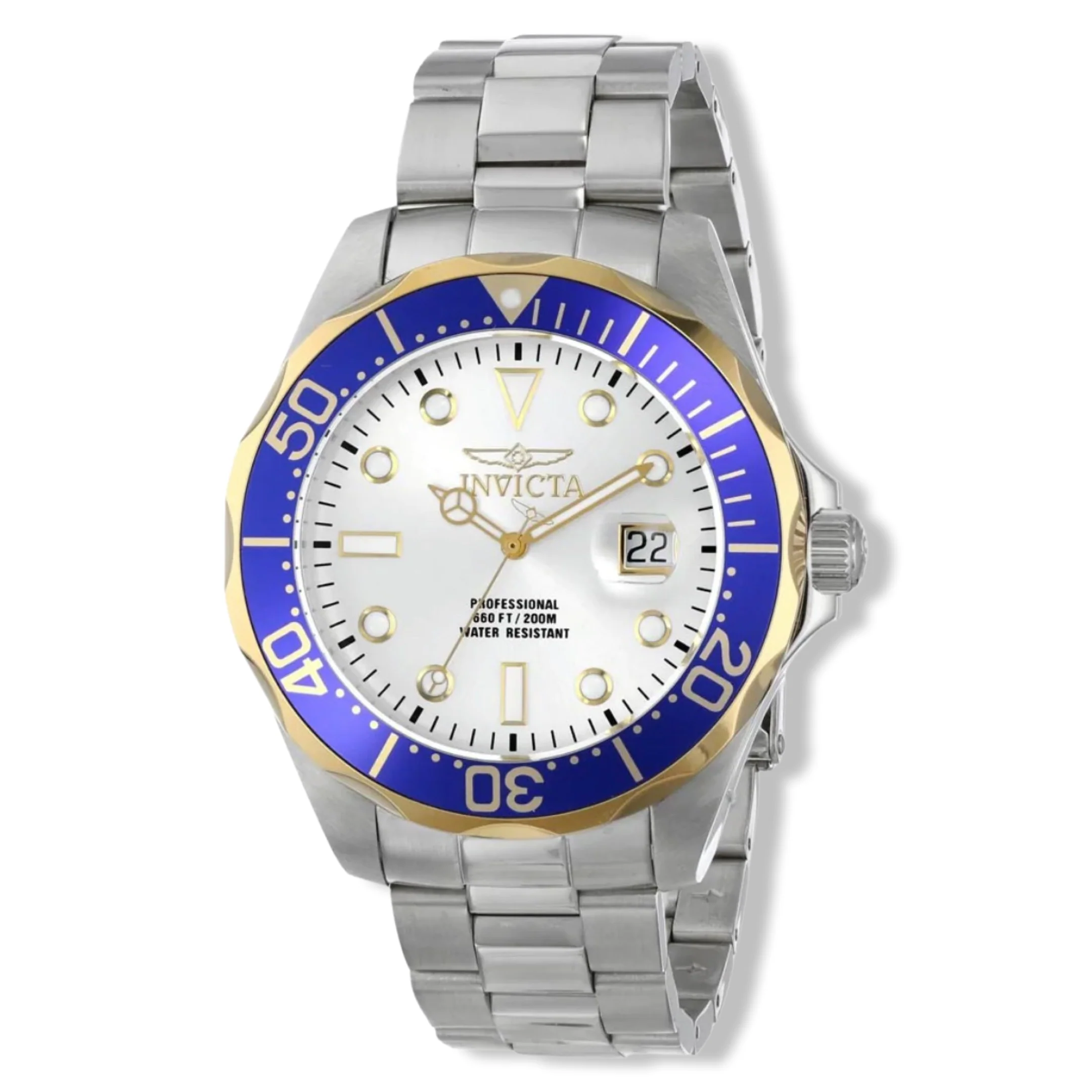 Invicta men’s watch from the grand diver collection, with a water resistance of 300 meters. A detailed royal blue bezel and silver dial, with luminescent hour markers. The perfect watch for every day wear.