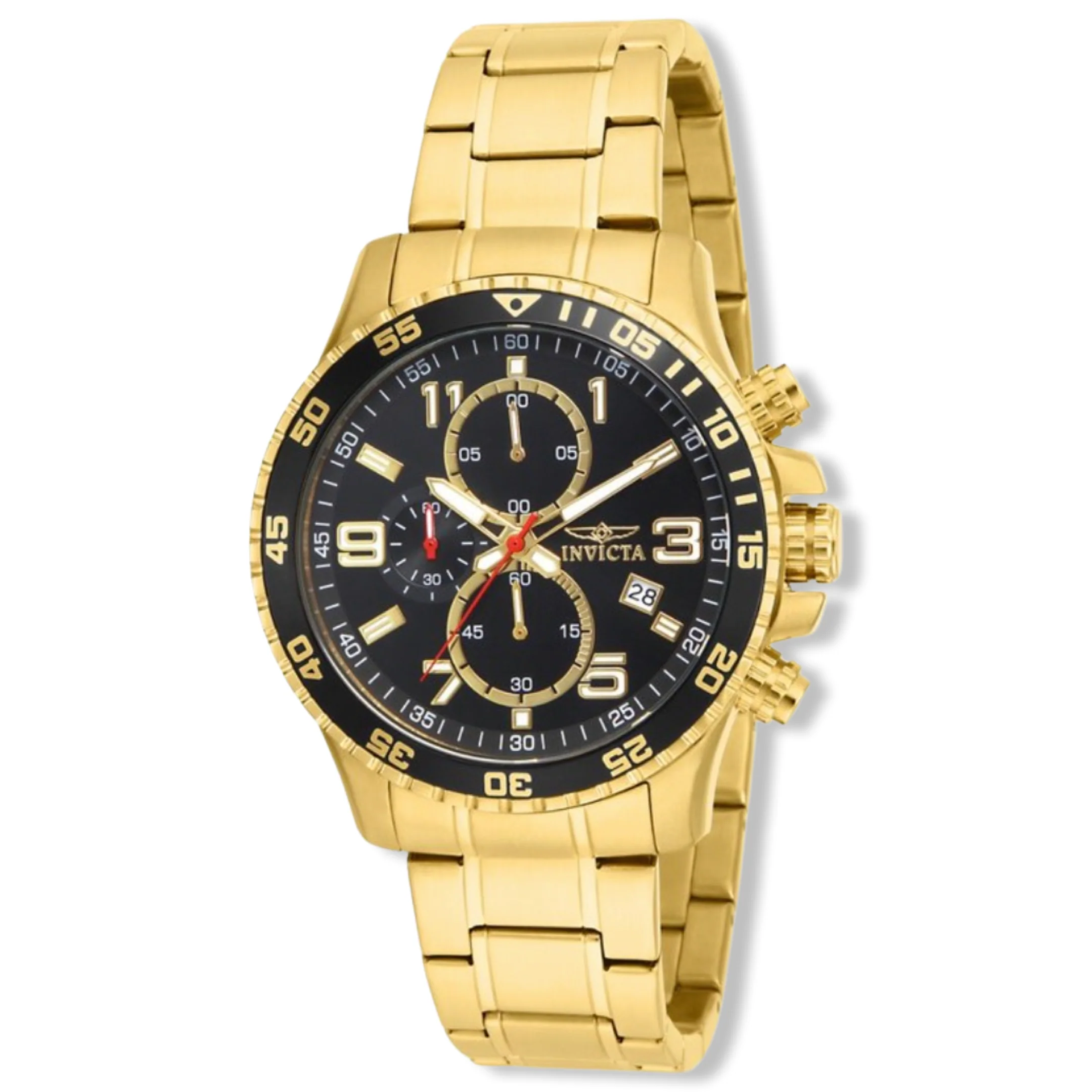 Invicta men’s specialty watch, all gold-tone with black dial with luminescent hands. The perfect watch for every day wear.