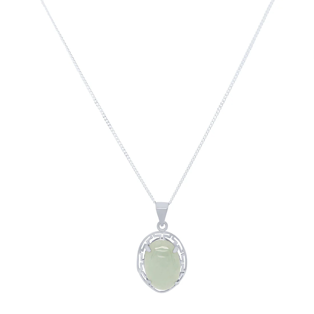 This fabulous Jade Oval Necklace in Sterling Silver features an oval look design with a fancy draping halo, set in stunning sterling silver.